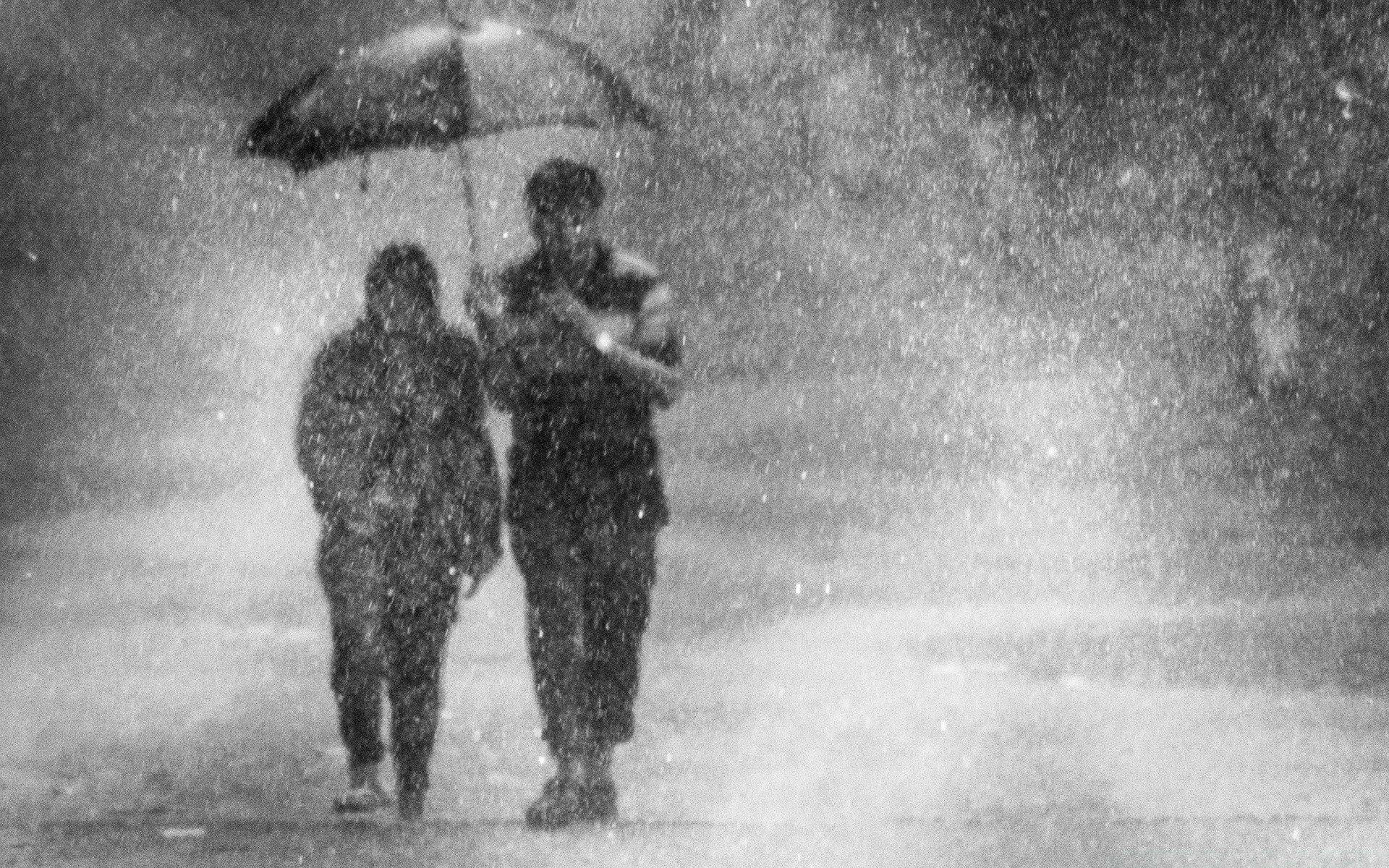 Ein erwachsener Mann trägt einen Regenschirm im Autospray