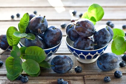 Reife Pflaumen in Schüsseln auf dem Tisch