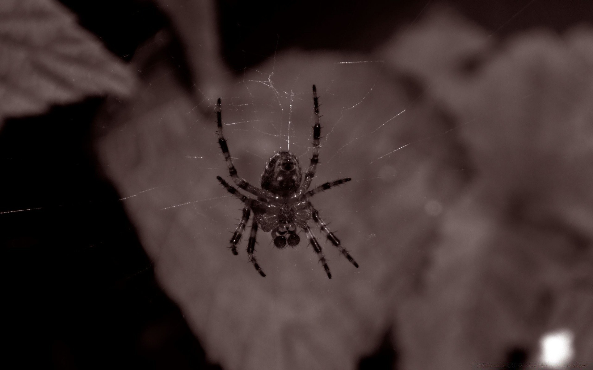 Spinne auf Spinnennetz auf grauem Blatthintergrund