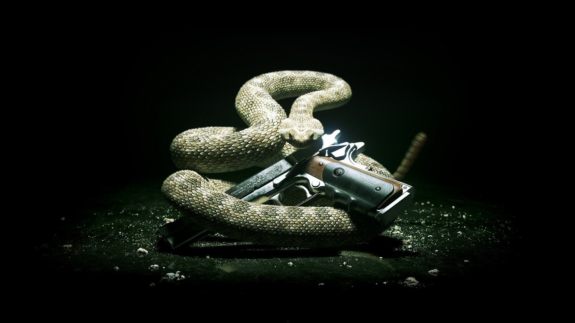 Eine Schlange mit einer Pistole. Grafik. Viper mit Pistole