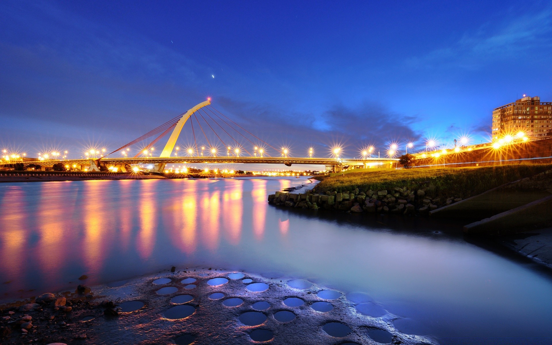 Stadt Sonnenuntergang auf See Hintergrund in der Nacht