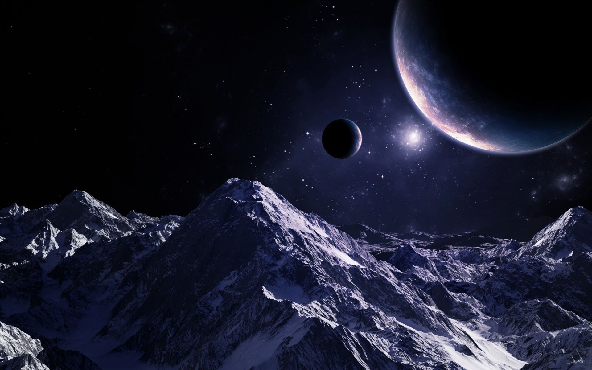Kosmische Landschaft, Mond und Planeten vor dem Hintergrund des Sternenhimmels