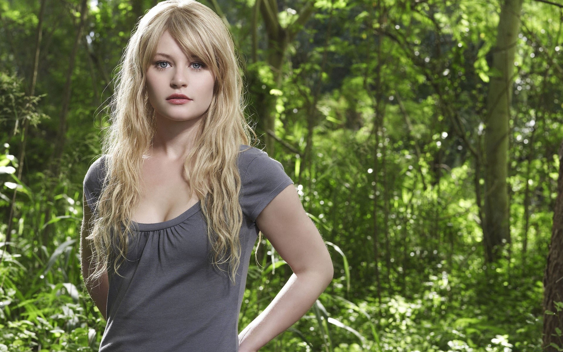 Ein Goldilocks im grauen T-Shirt geht im Grünen des Waldes spazieren
