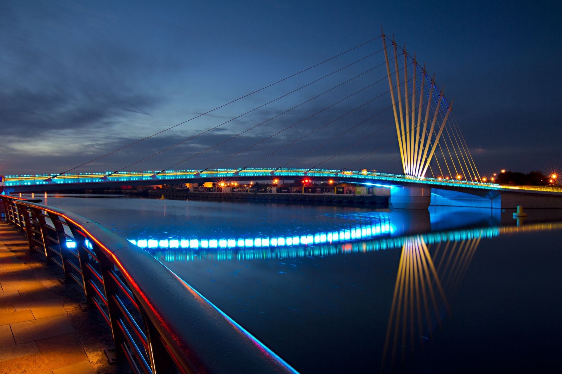 Stadt Abend Brücke Makro Lichter Promenade Geländer