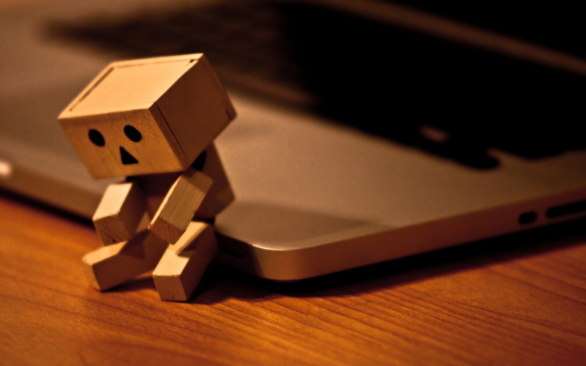 Trauriger hölzerner Mann sitzt auf einem Laptop