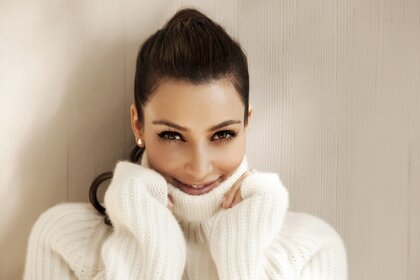 Schauspielerin mit blauen augen und blonden haaren im pullover mit weitem halsSchauspielerin mit blauen Augen und blonden Haaren im Pullover mit weitem Hals