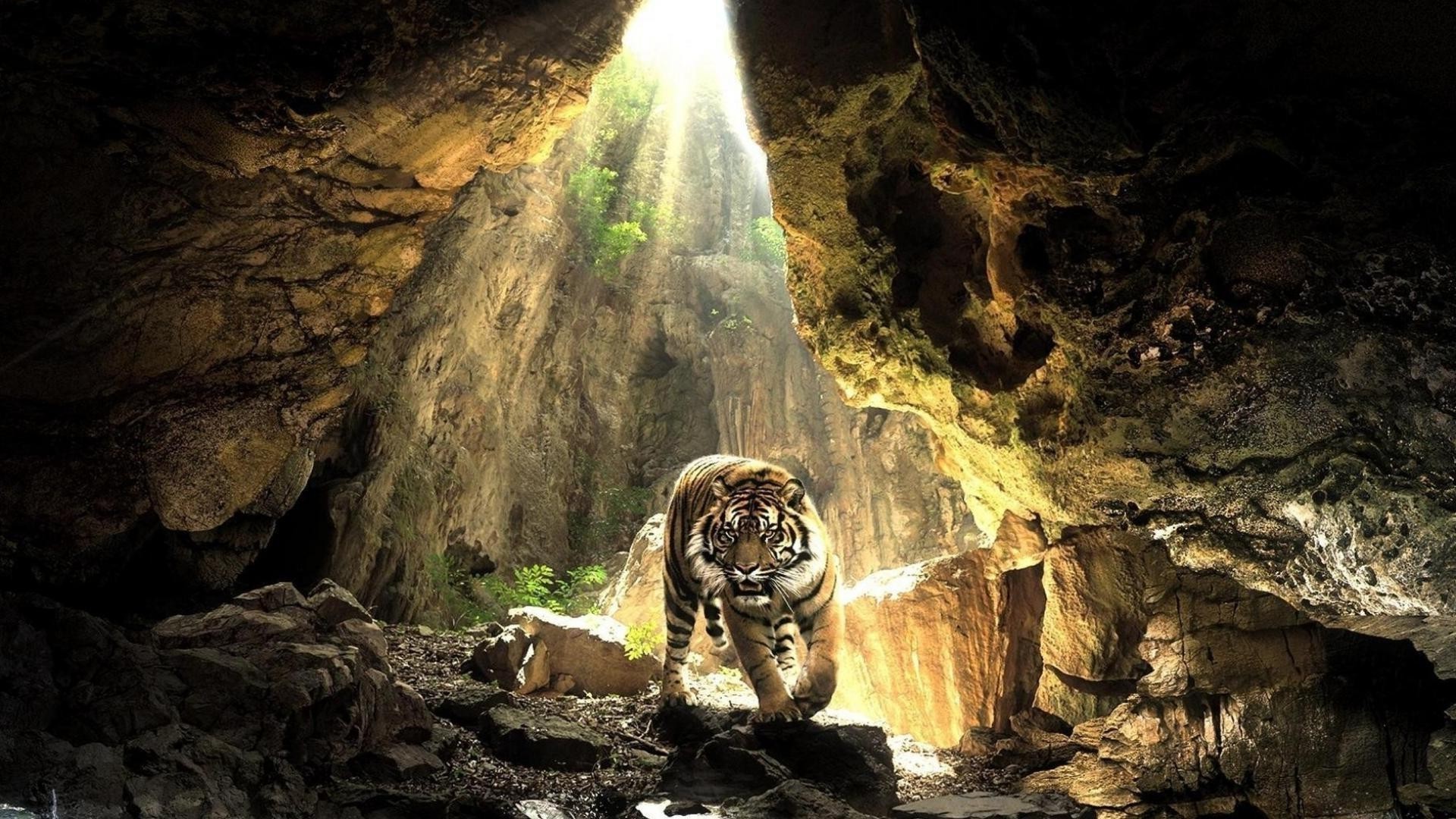 Tiger in der Höhle von den Strahlen der Sonne erleuchtet