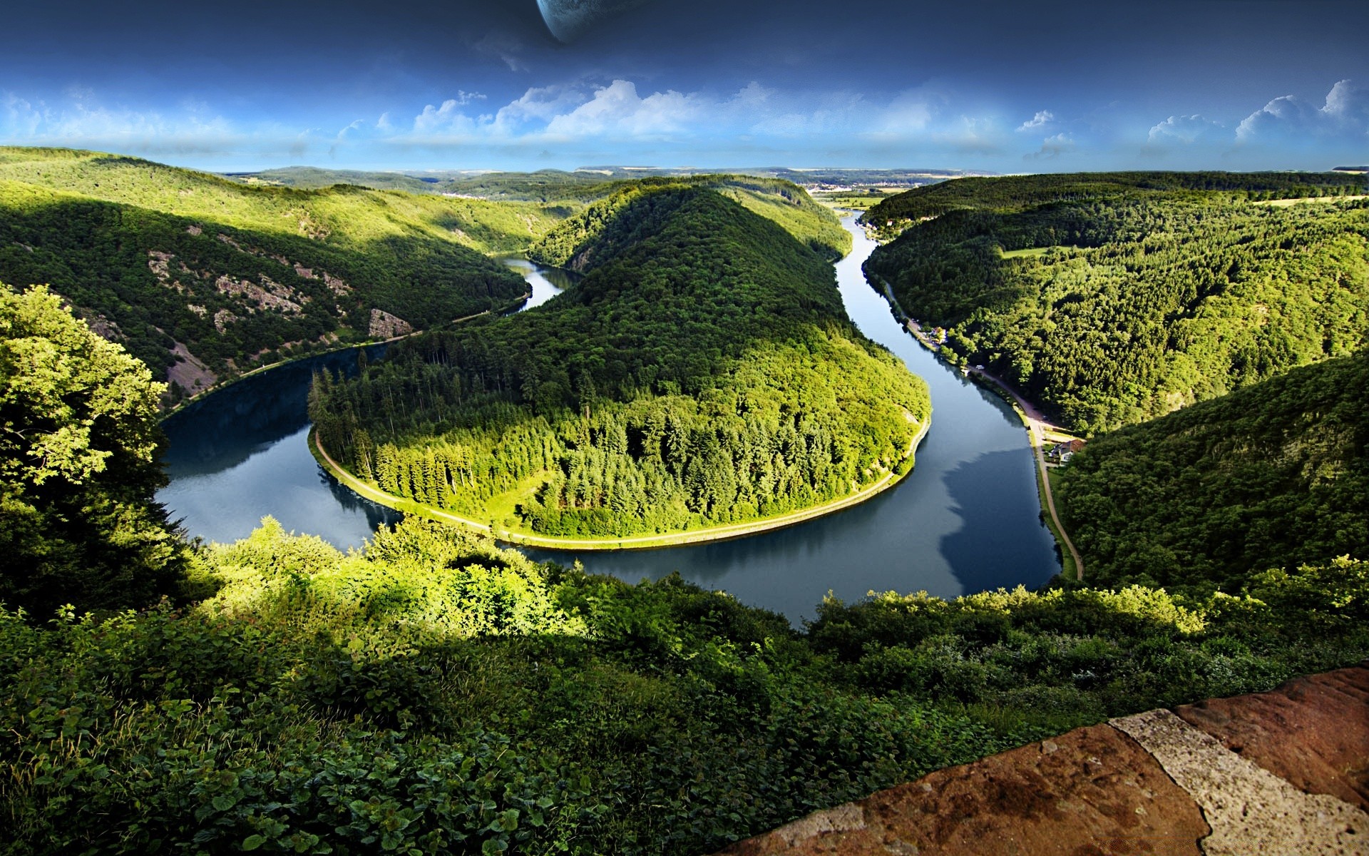 Flussschleife umgeben von bewaldeten Hügel