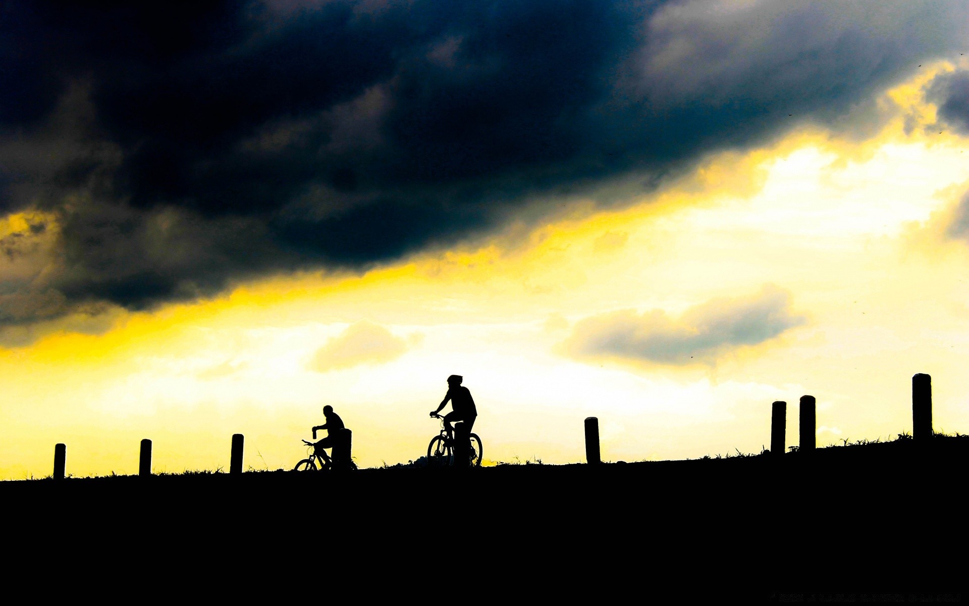 Radfahrer vor dem Hintergrund von Sonnenuntergang oder Dämmerung