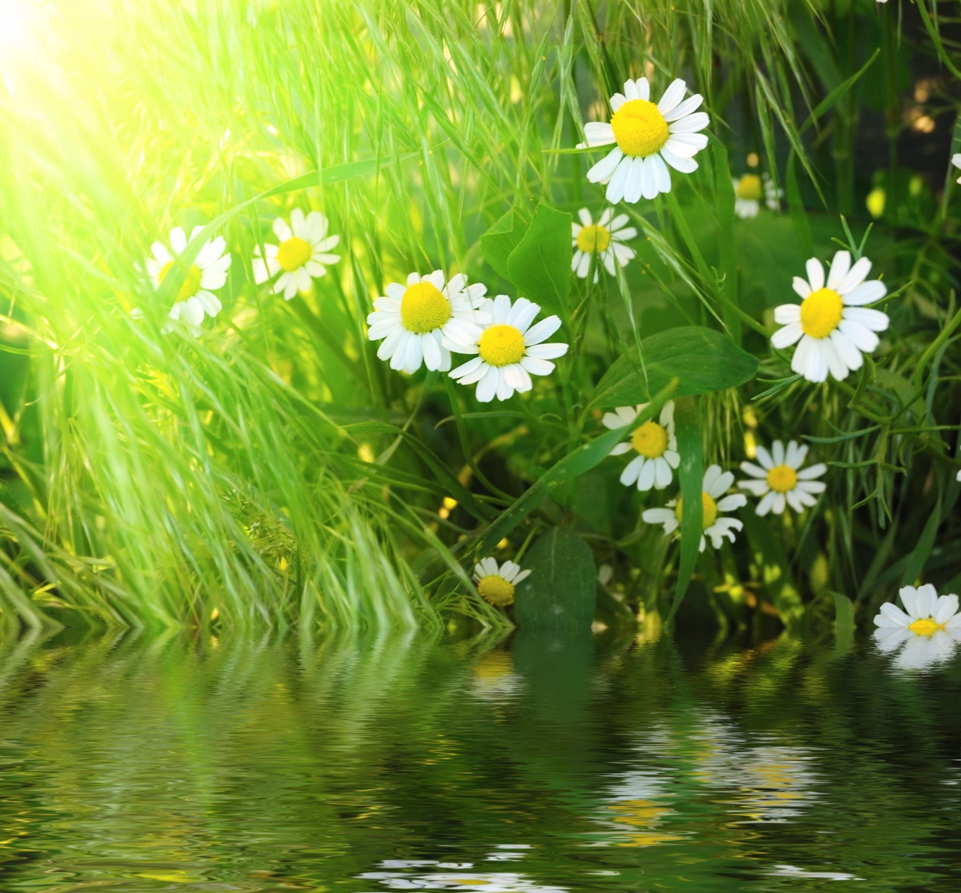 Gänseblümchen und Gras wachsen entlang des Flusses