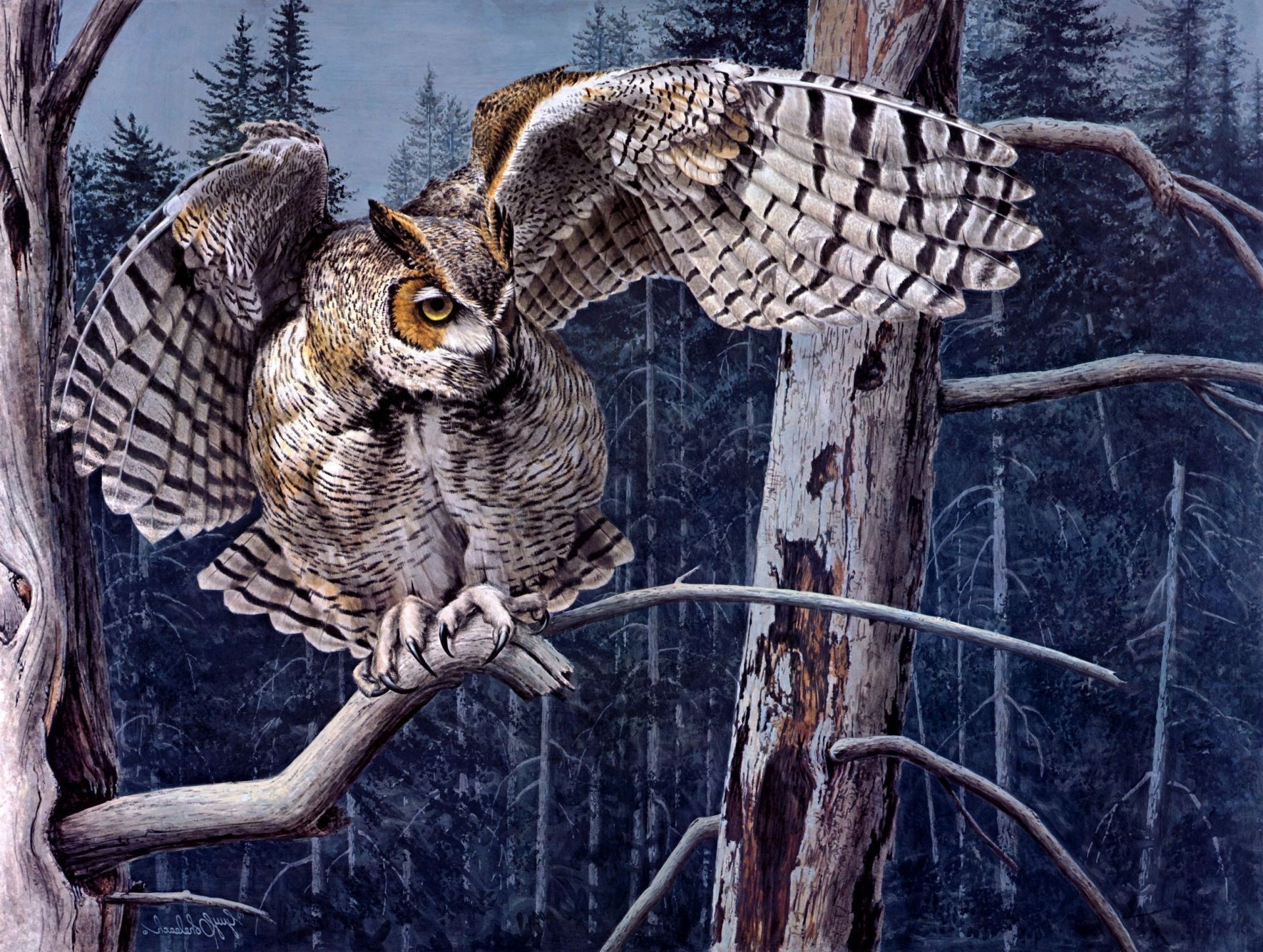 Eine gemalte Eule auf einem Ast