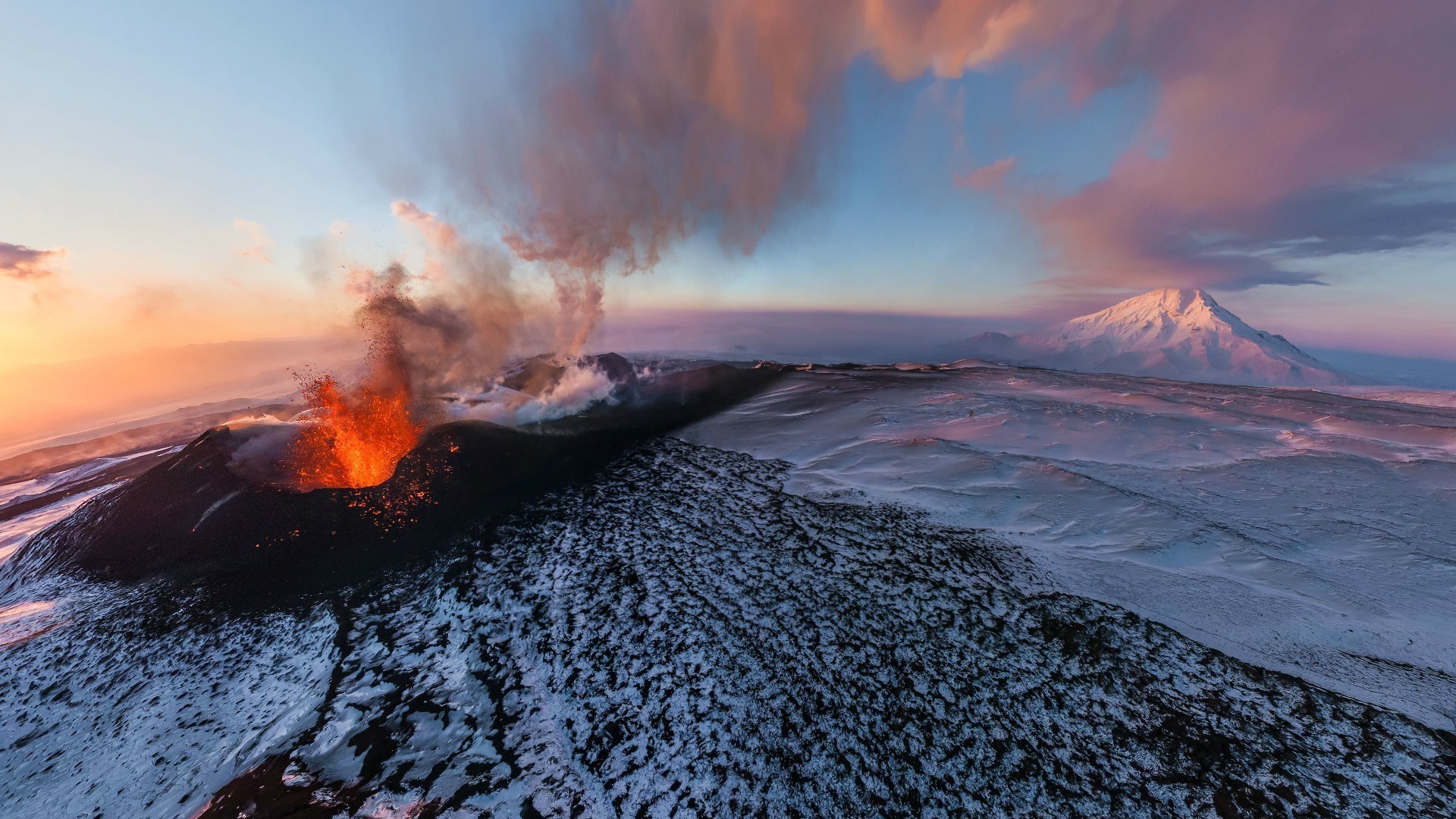 Vulkanausbruch in schneebedeckten Bergen