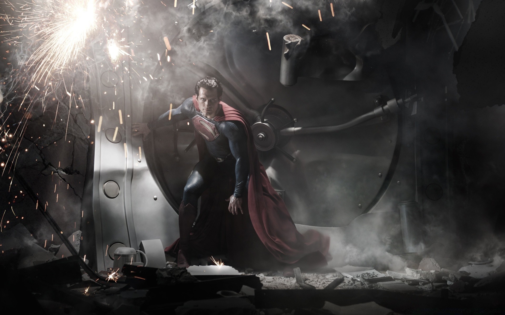 Superman vor dem hintergrund eines explodierenden banklagersSuperman vor dem Hintergrund eines explodierenden Banklagers
