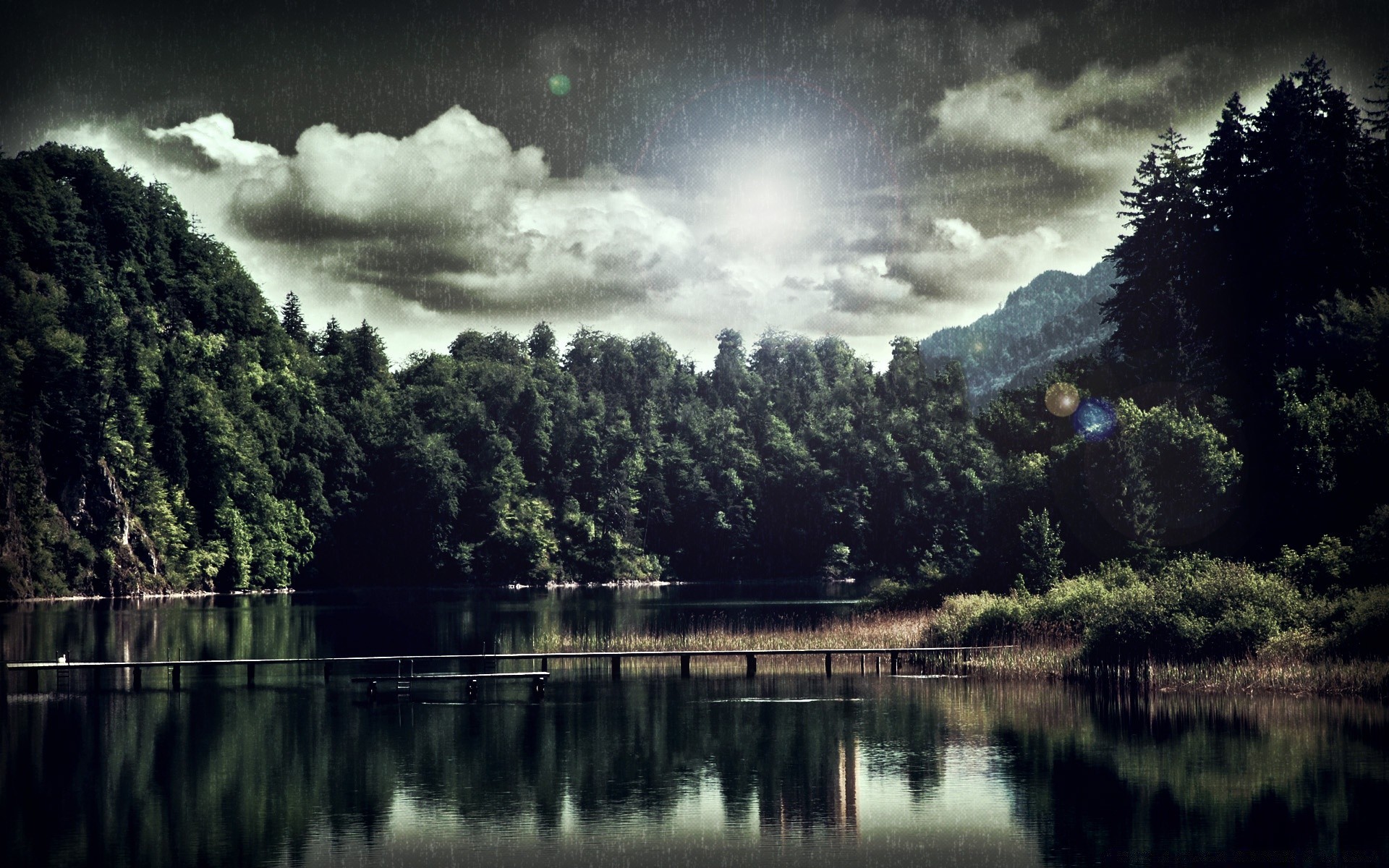 Die Landschaft ist ein großer See rund um den Wald und in der Ferne ein hoher Berg
