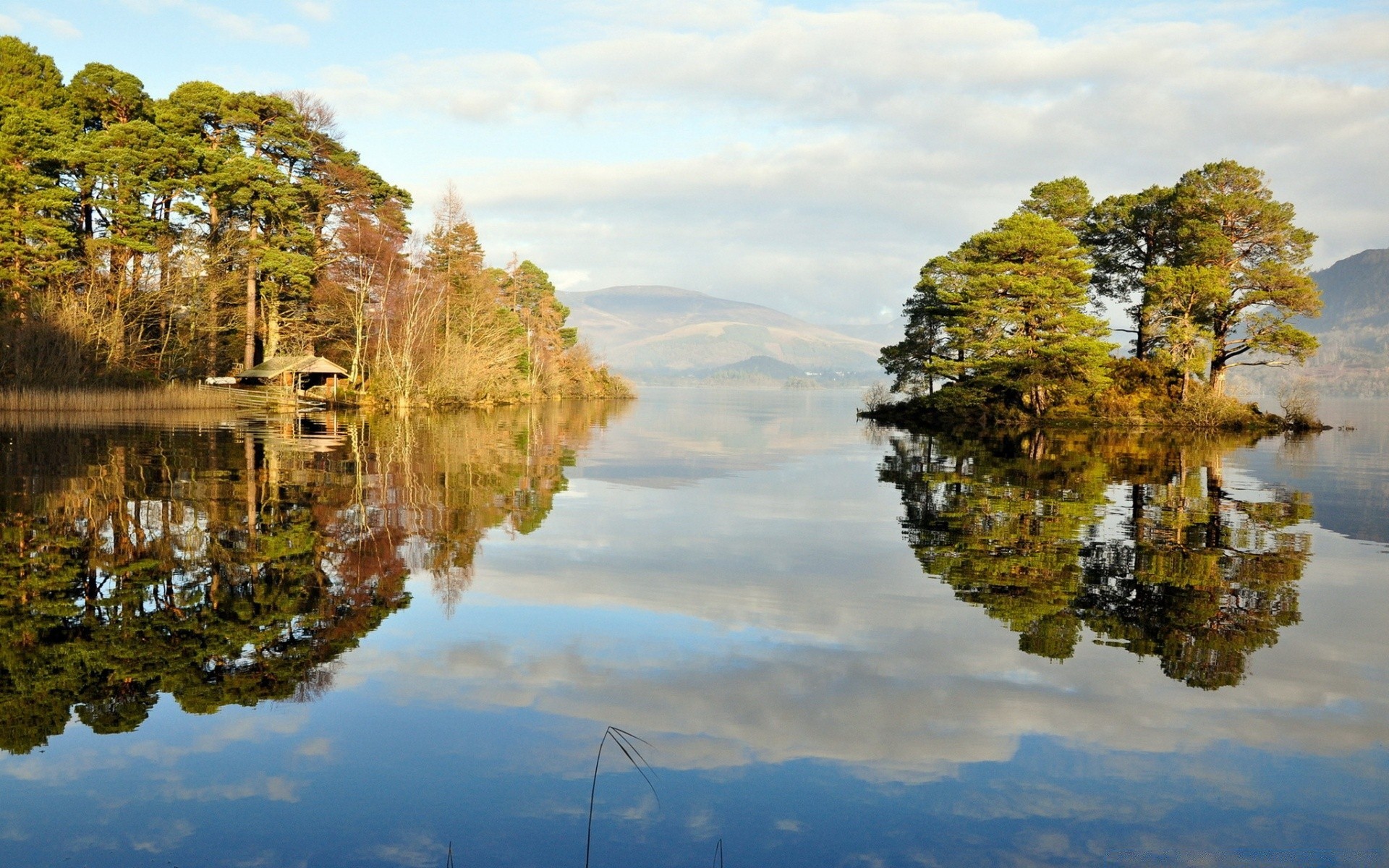 Grasbewachsene Küste und ein See mit reflektierendem bewölktem Himmel