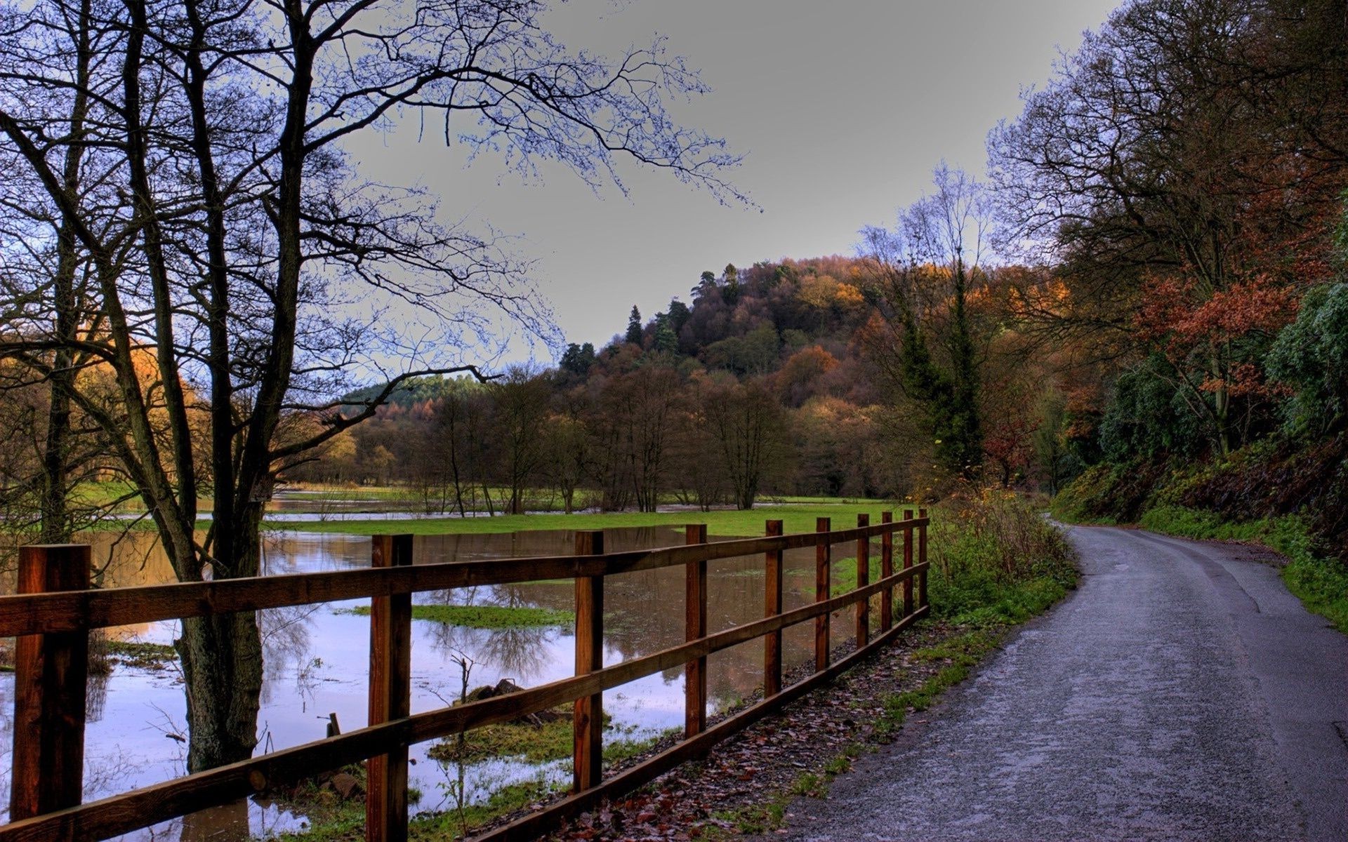 Straße am See im Herbst. Gefallene Blätter