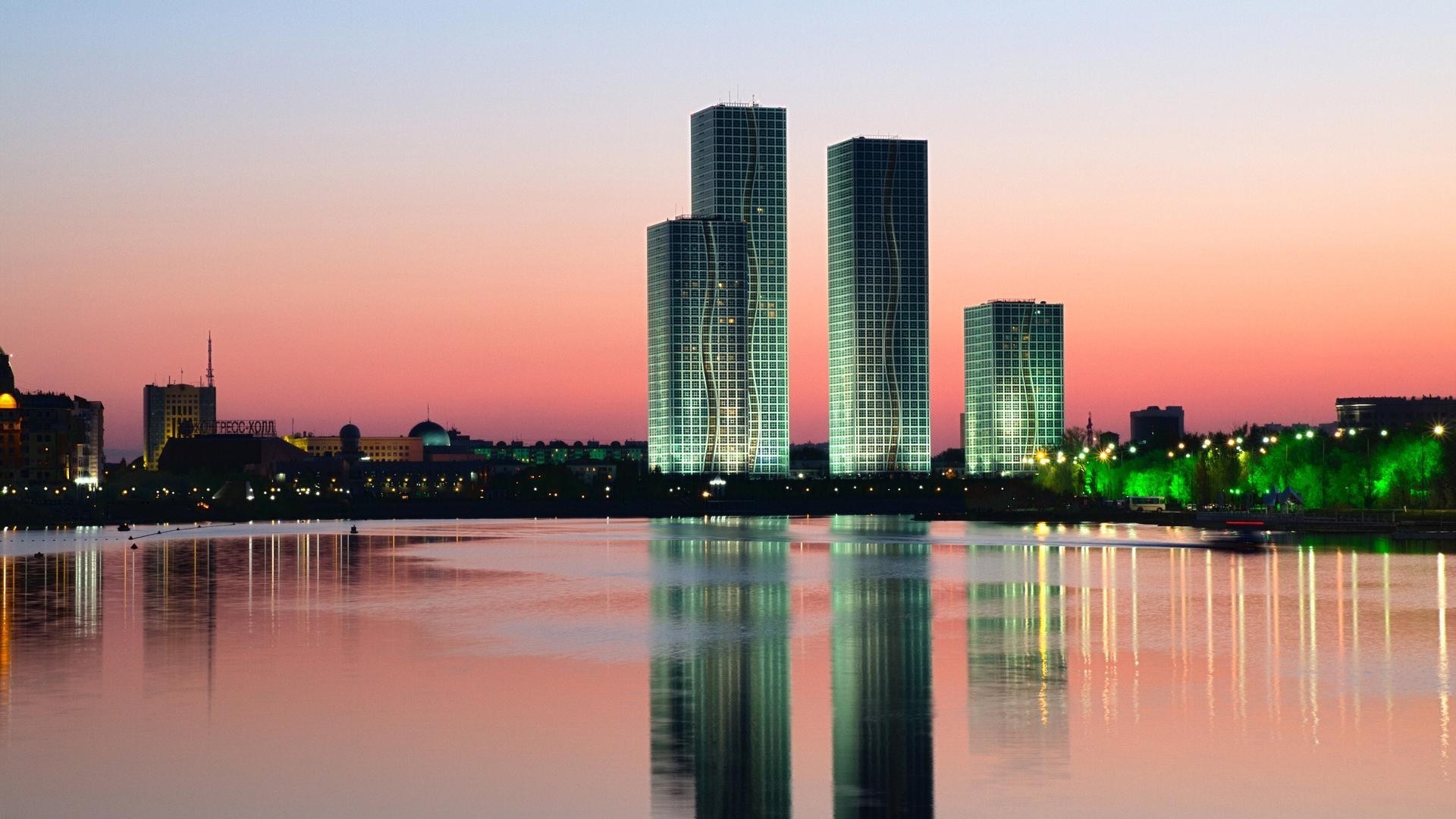Die Architektur der Stadt und die Reflexion des Sonnenuntergangs im Wasser