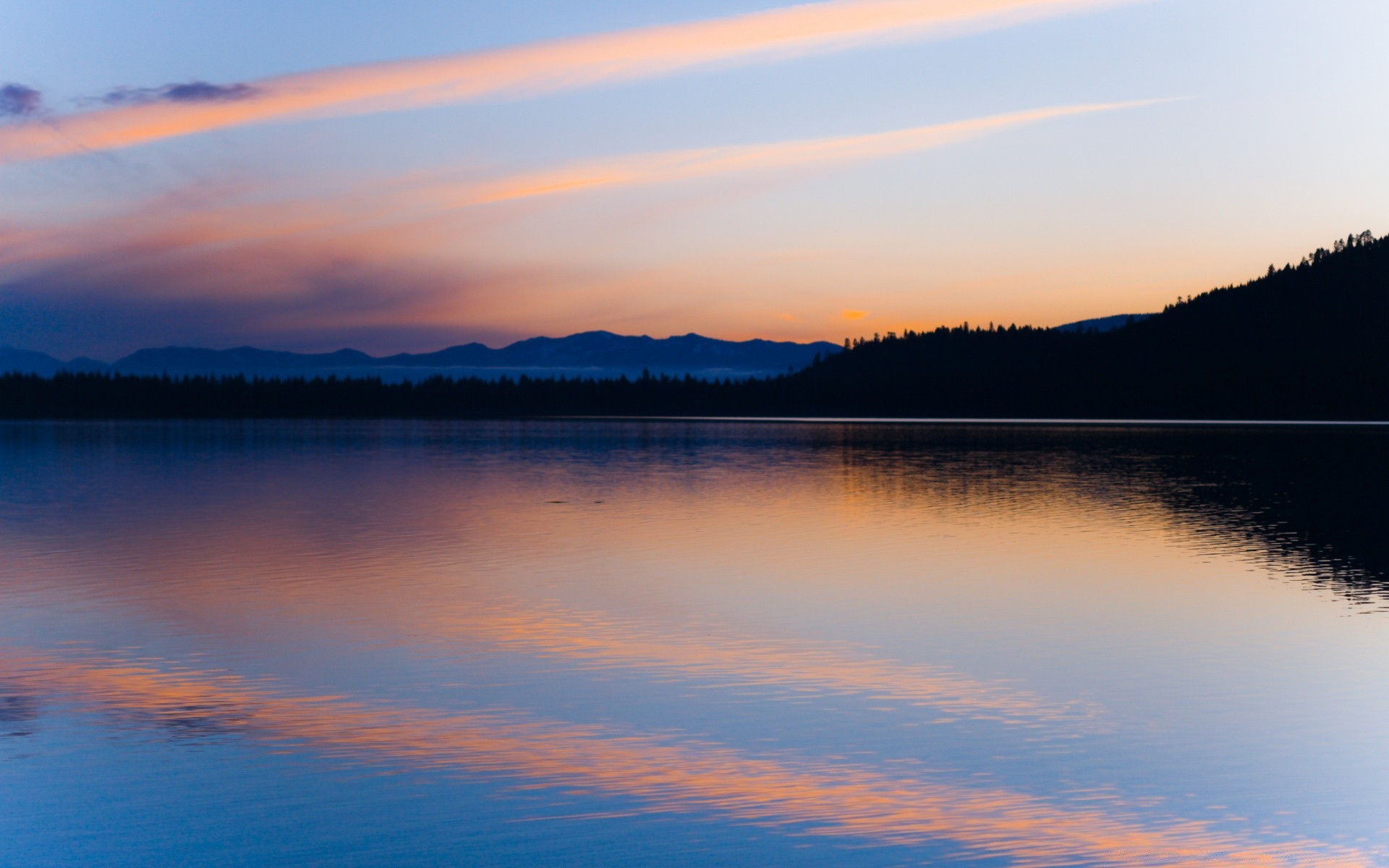 Morgendämmerung am See, Reflexion der Bäume im Wasser