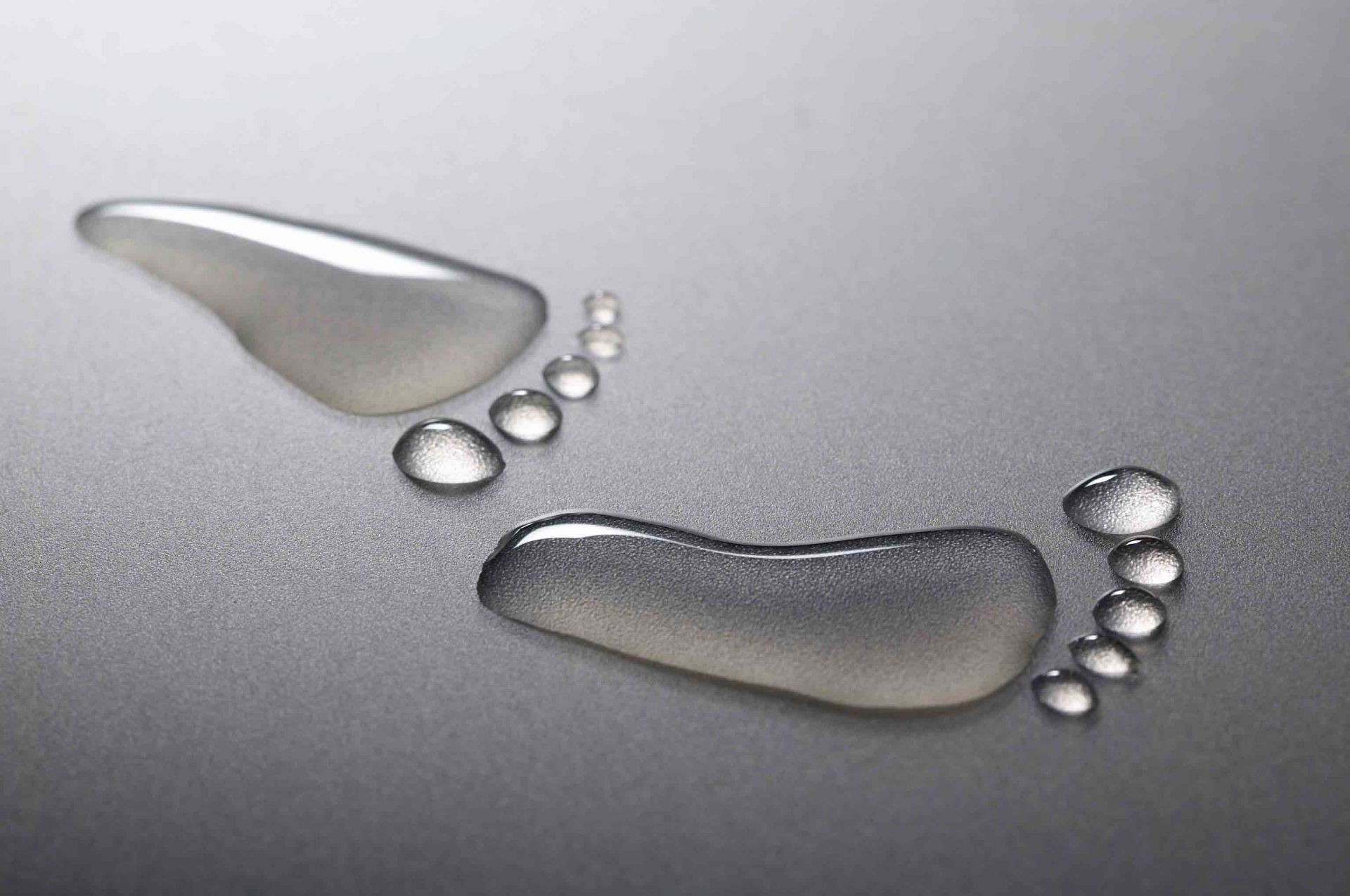 Tropfenförmige Fußabdrücke auf einer grauen Oberfläche