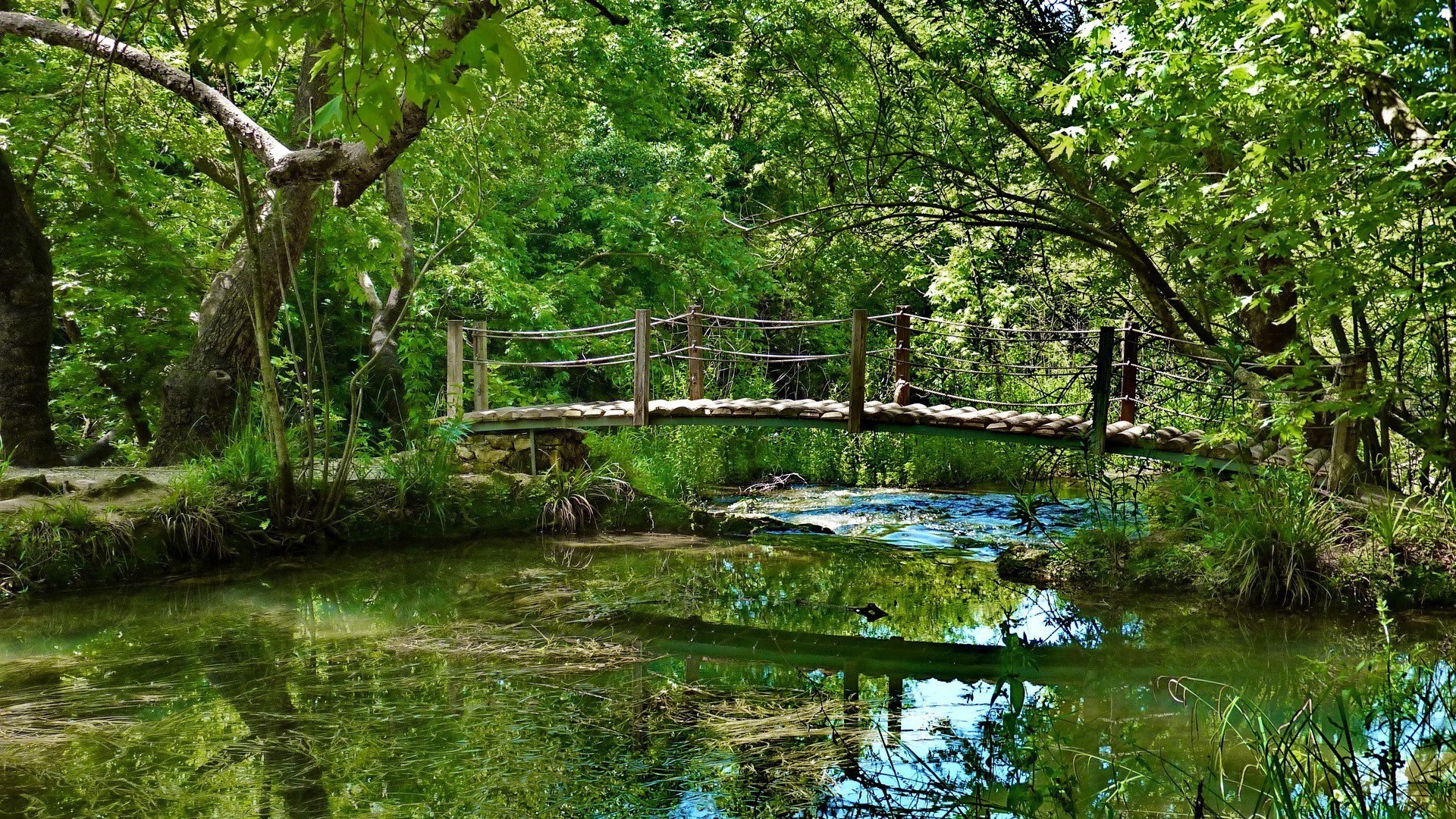 Hölzerne Hängebrücke über dem Teich