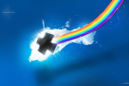 Die straße, die in einen regenbogen und einen bewölkten himmel übergehtDie Straße, die in einen Regenbogen und einen bewölkten Himmel übergeht