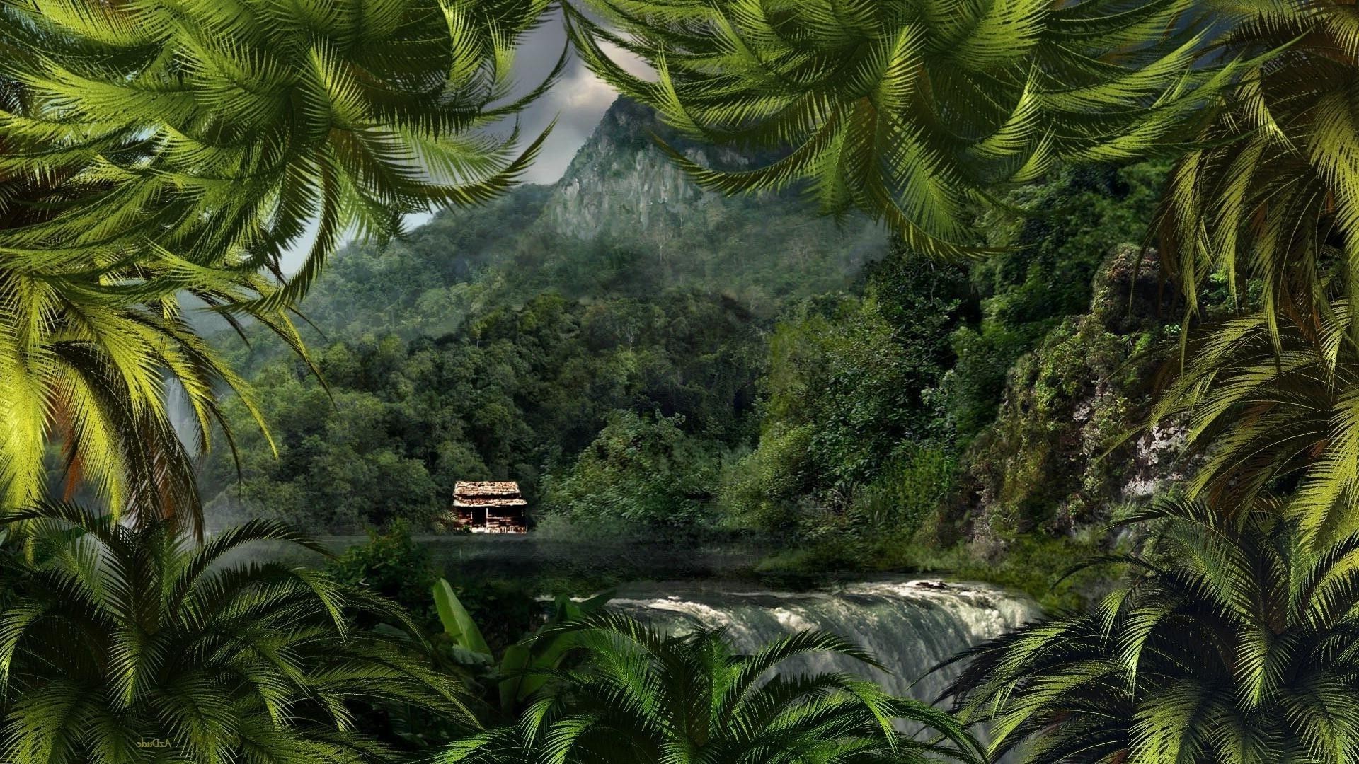 Hütte in der Nähe eines überwucherten Teiches im Regenwald