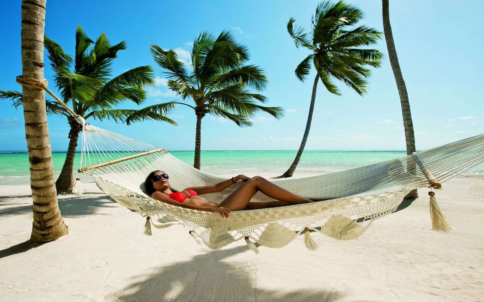 Mädchen ruht sich in einer hängematte am strand ausMädchen ruht sich in einer Hängematte am Strand aus