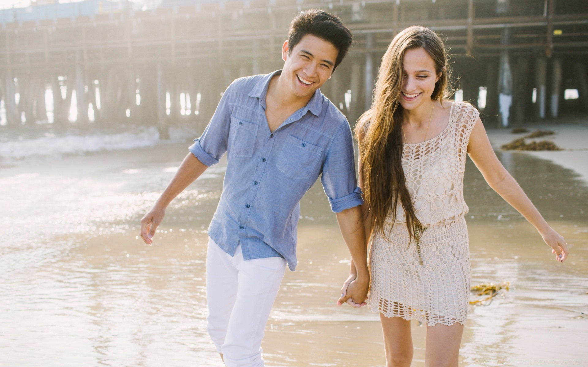 Mädchen mit Freund am Ufer an einem sonnigen Tag