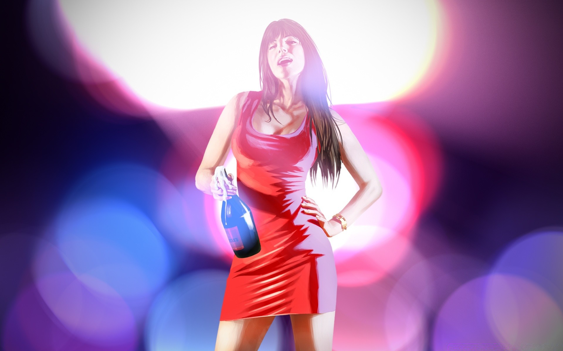 Das Mädchen in Rot hat eine Flasche Champagner entkorkt und möchte etwas feiern