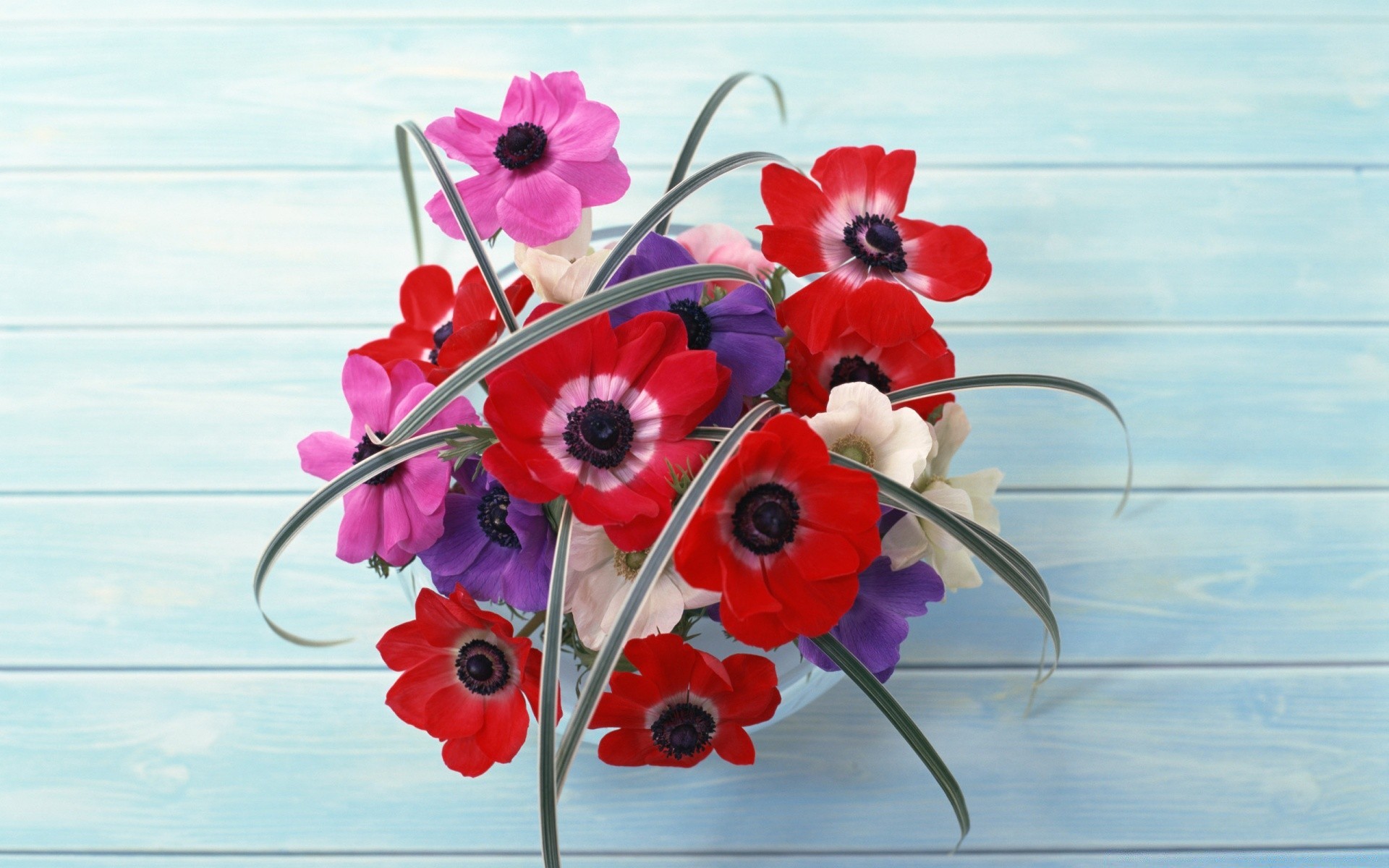 Blumenstrauß aus Blumen im Topf und auf einem blauen Tisch