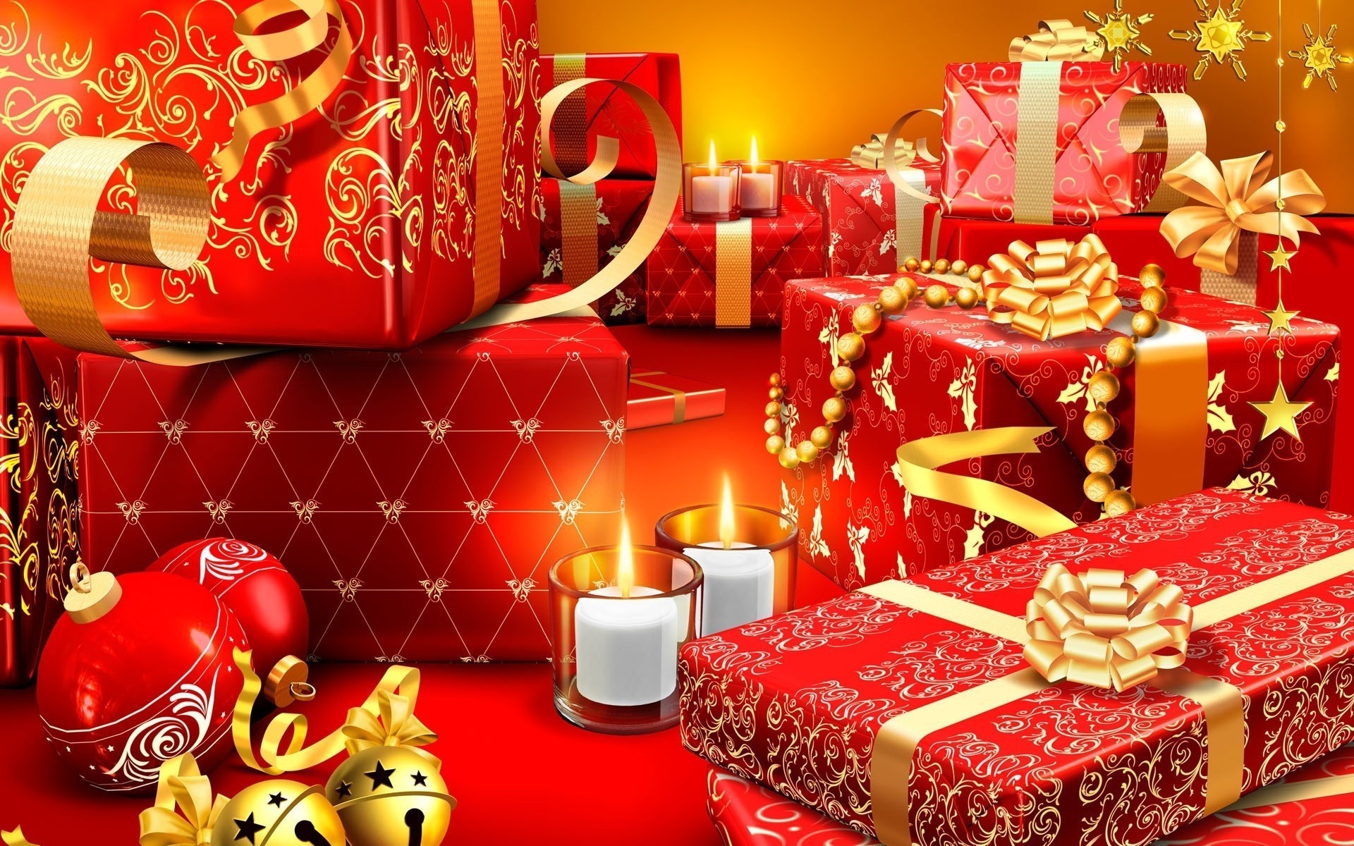 Rote vergoldete Geschenke und Weihnachtsspielwaren