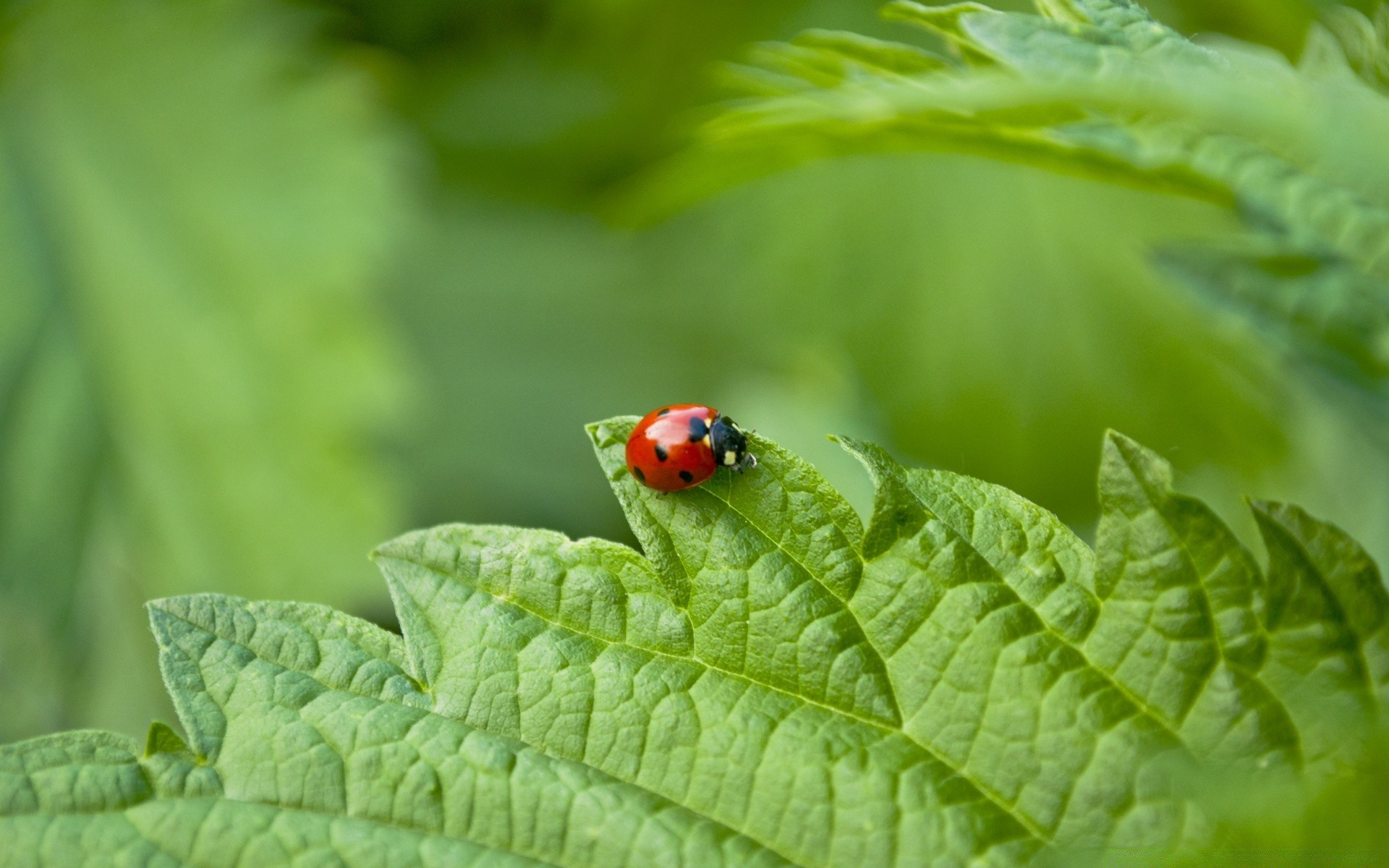 Leuchtender roter Marienkäfer auf grünem Blatt