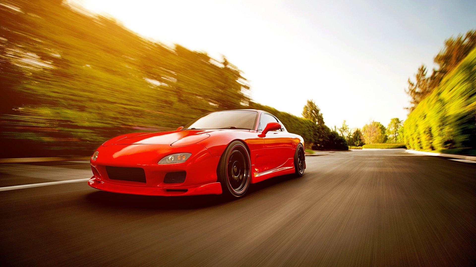Ein roter Sportwagen steht vor dem Hintergrund der Nachtstadt in Lichtern
