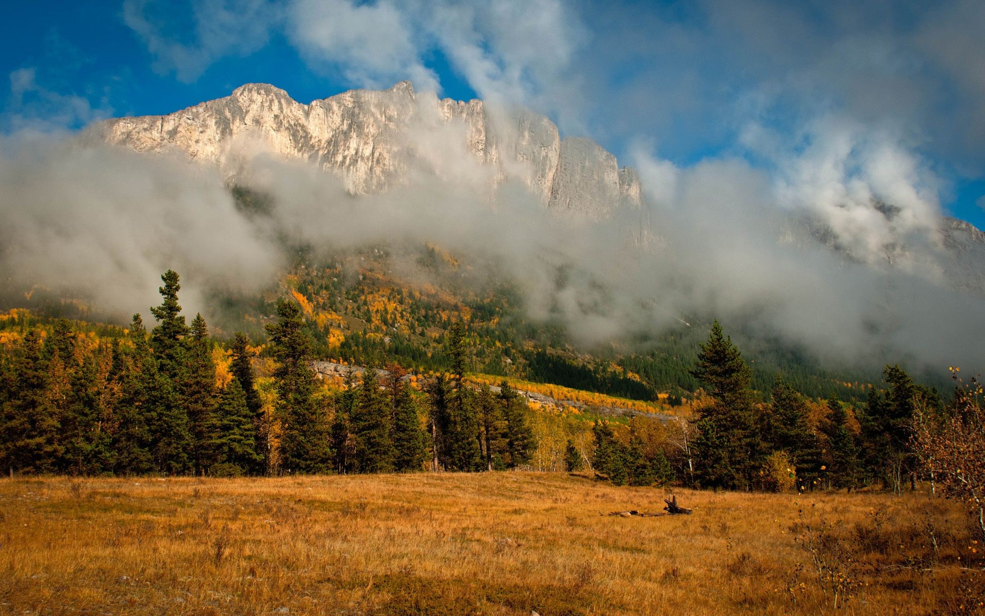 Eine Landschaft, die Berge, Wälder und Wolken zeigt