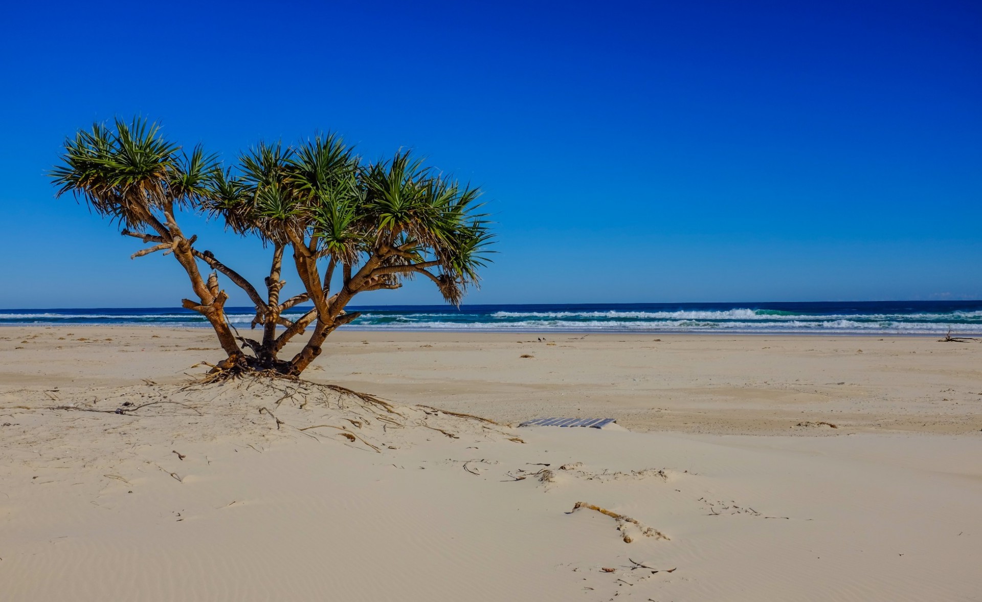 Palmen, Sonnenuntergang, weißer Sand und Meer in sanften Farben