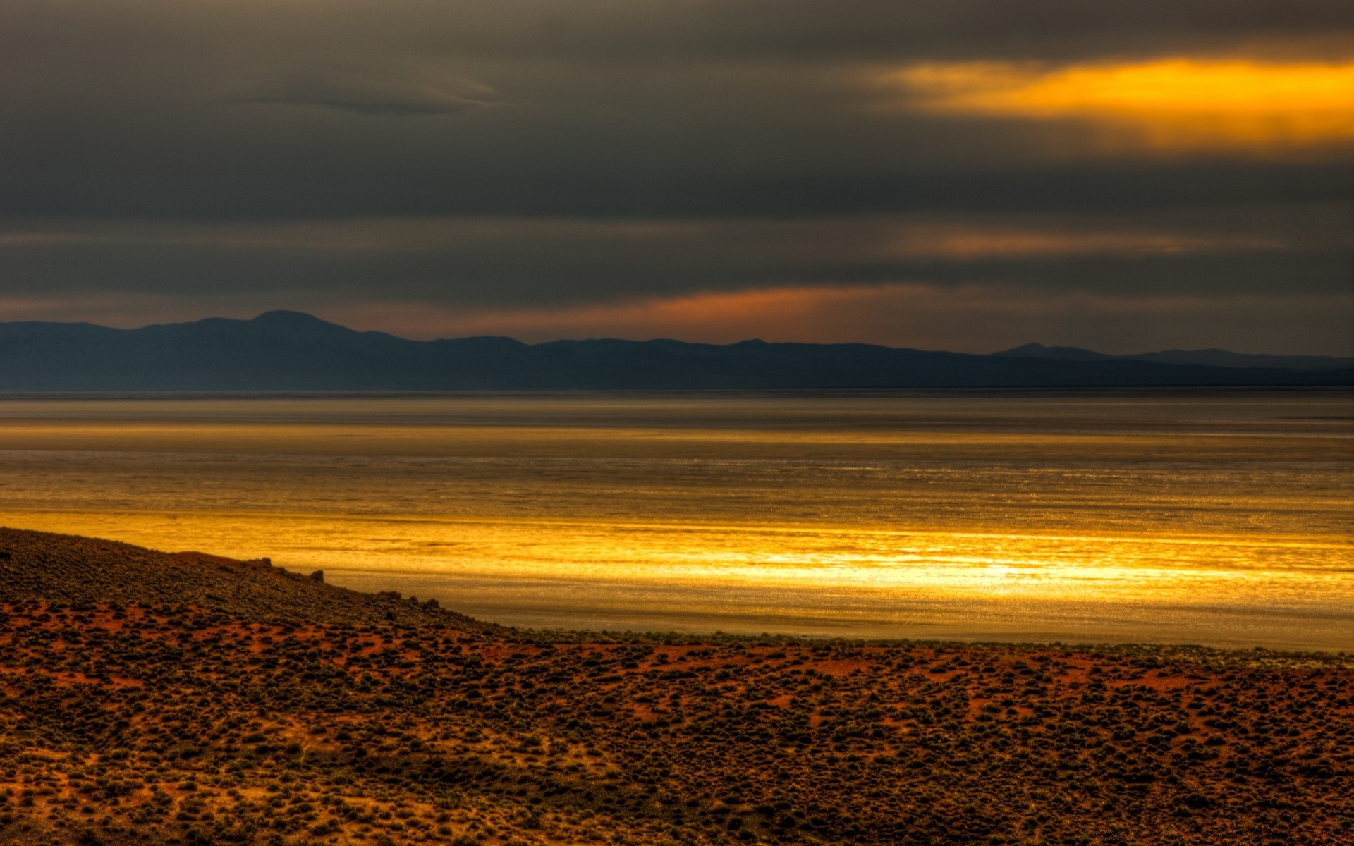 Niedriger Sonnenuntergang über dem einsamen Ufer des Sees