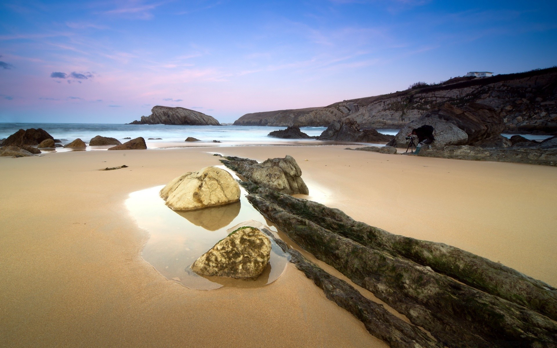 Der Mann, der die Morgendämmerung am Meer trifft