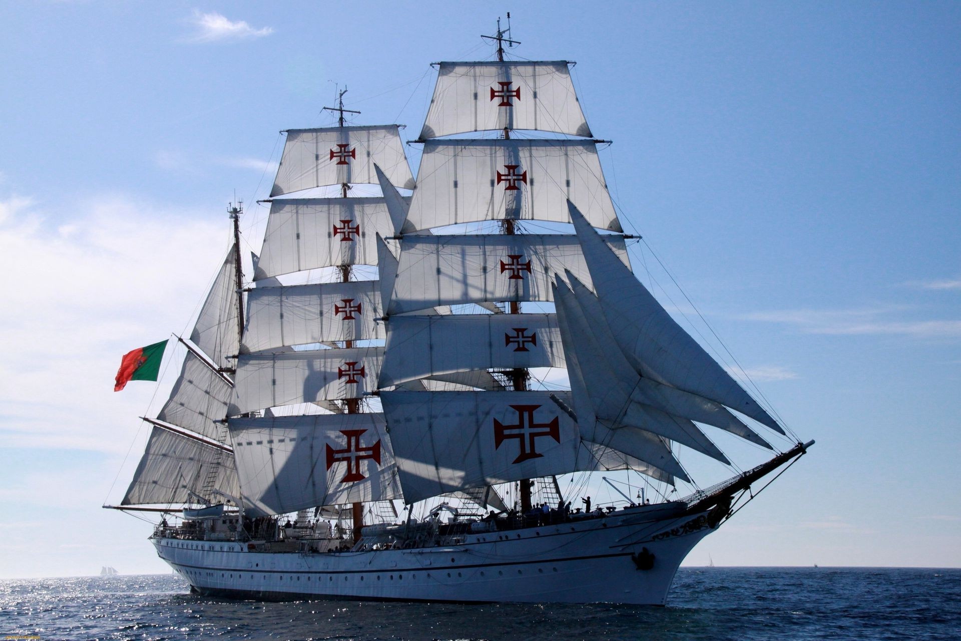Ein Schiff unter weißen Segeln geht auf dem Seeweg