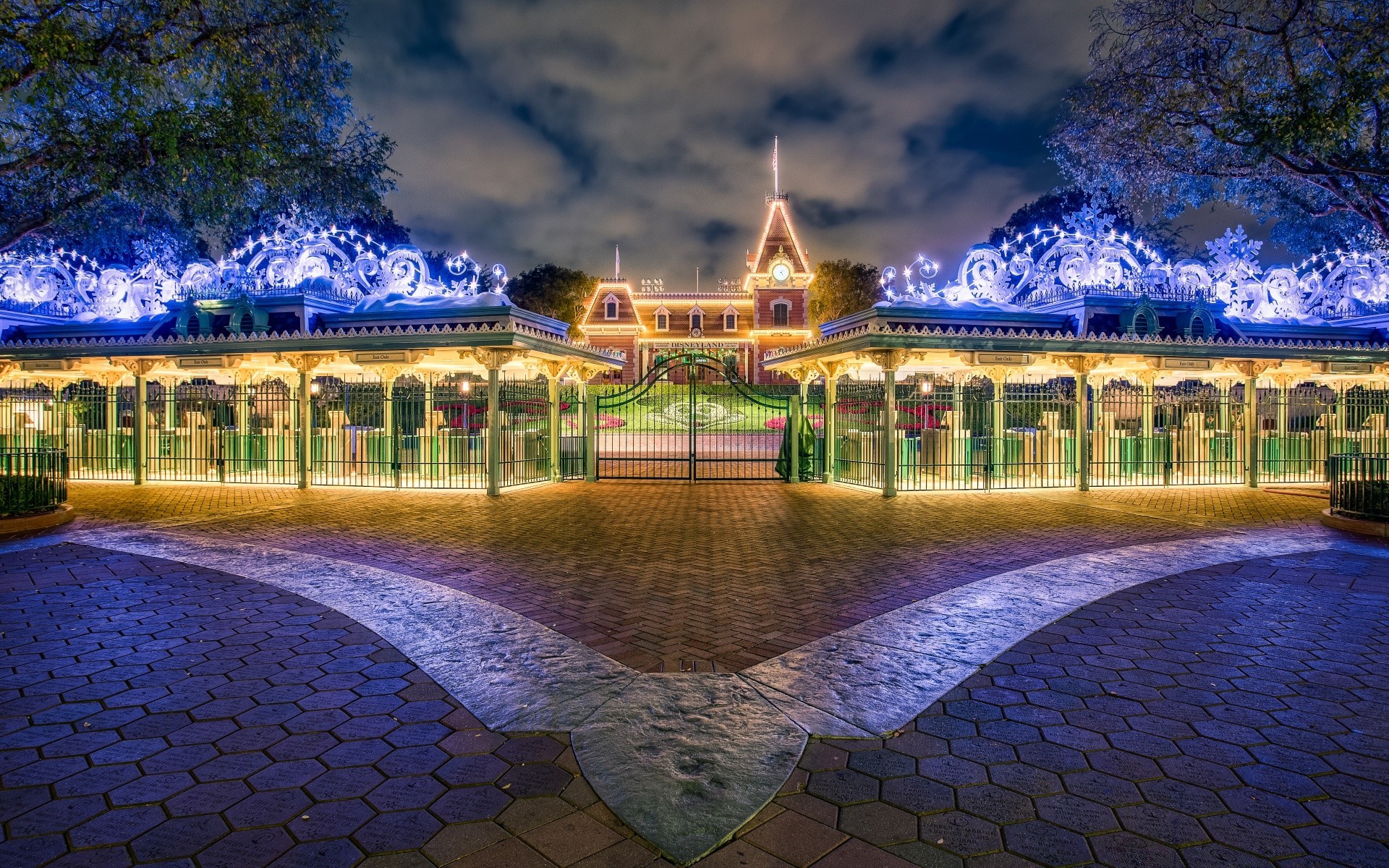 Gebäude im asiatischen Stil mit Nachtbeleuchtung auf Wasserhintergrund