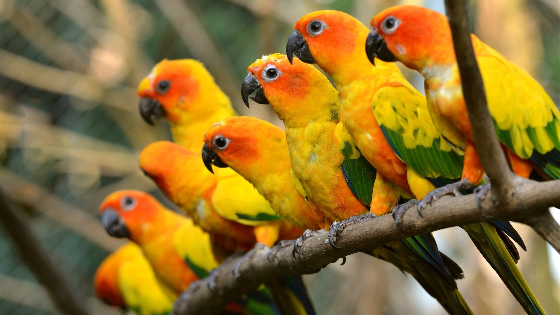 Vier tropische Papageien auf einem Ast