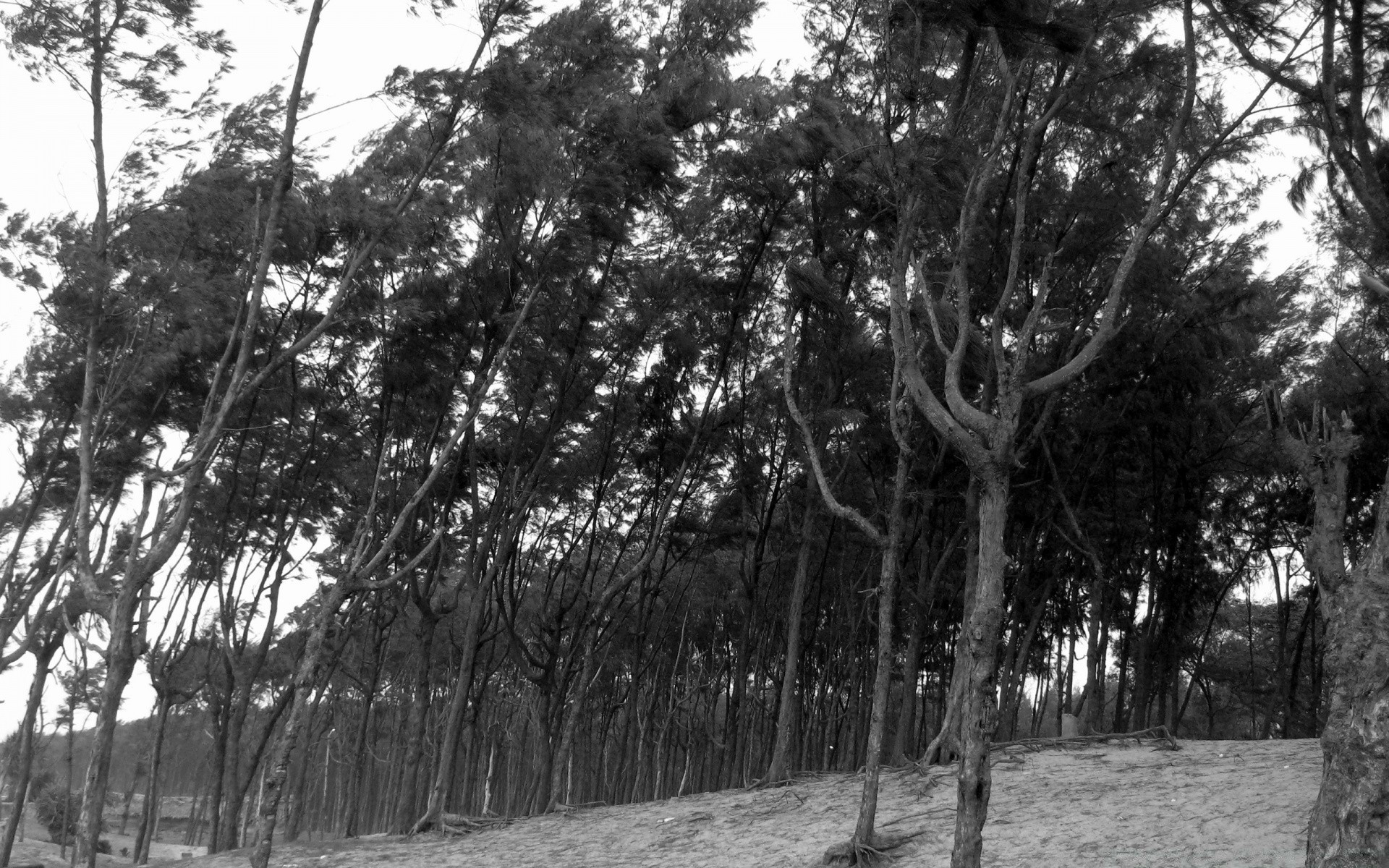 Schwarz-Weiß-Bild mit dem Mond über dem Wald