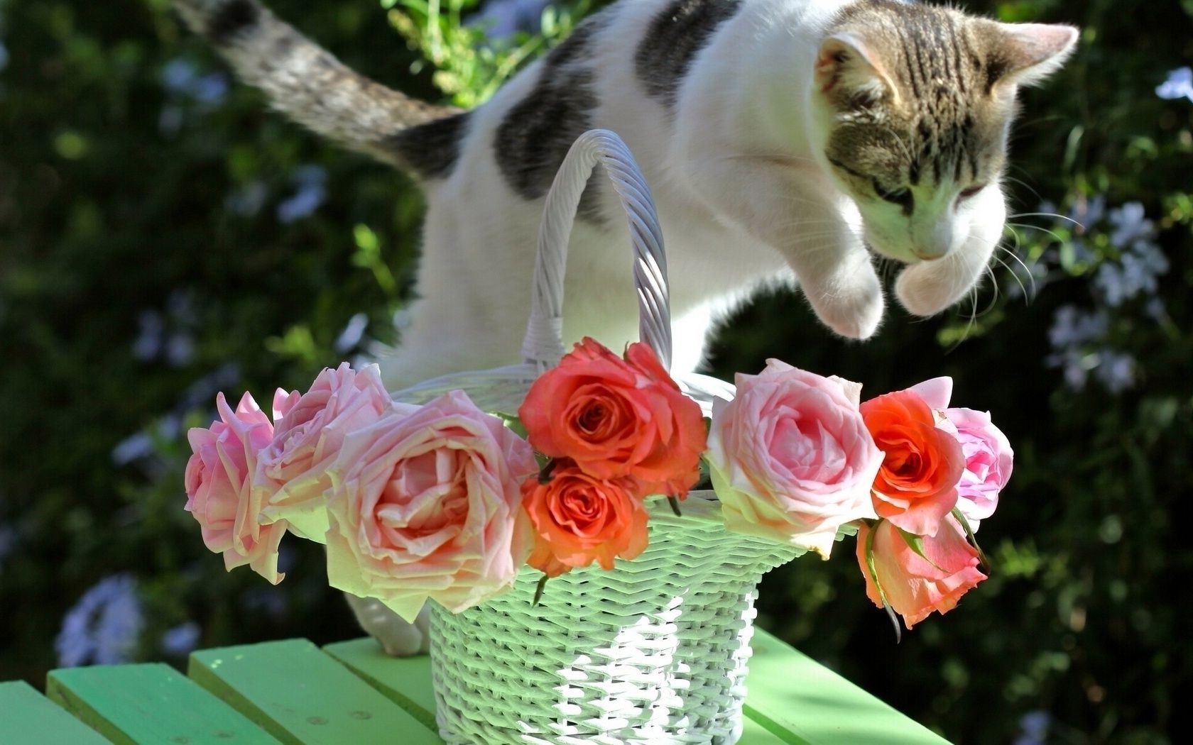 Ein mädchen auf einer katze fliegt durch die stadt am regenbogenEin Mädchen auf einer Katze fliegt durch die Stadt am Regenbogen