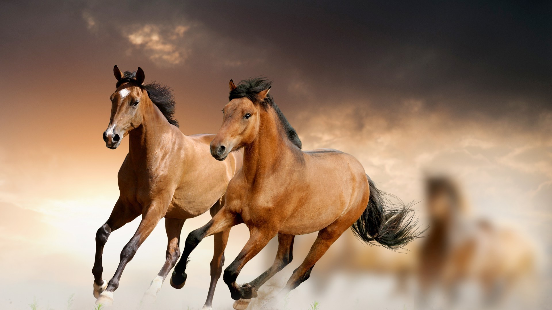 Ein paar Pferde laufen bei Sonnenuntergang über das Feld