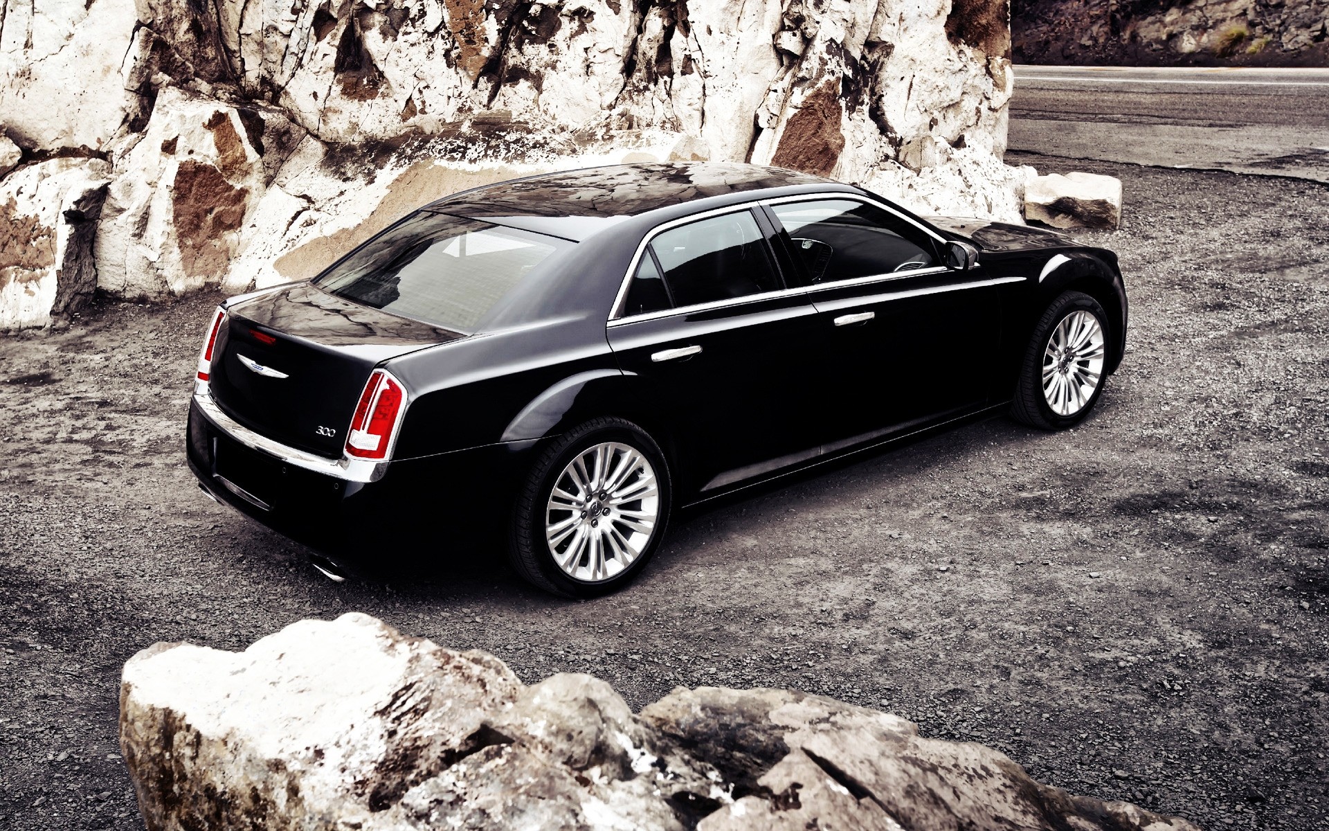 Schwarzes auto auf der straße in der nähe einer felswandSchwarzes Auto auf der Straße in der Nähe einer Felswand