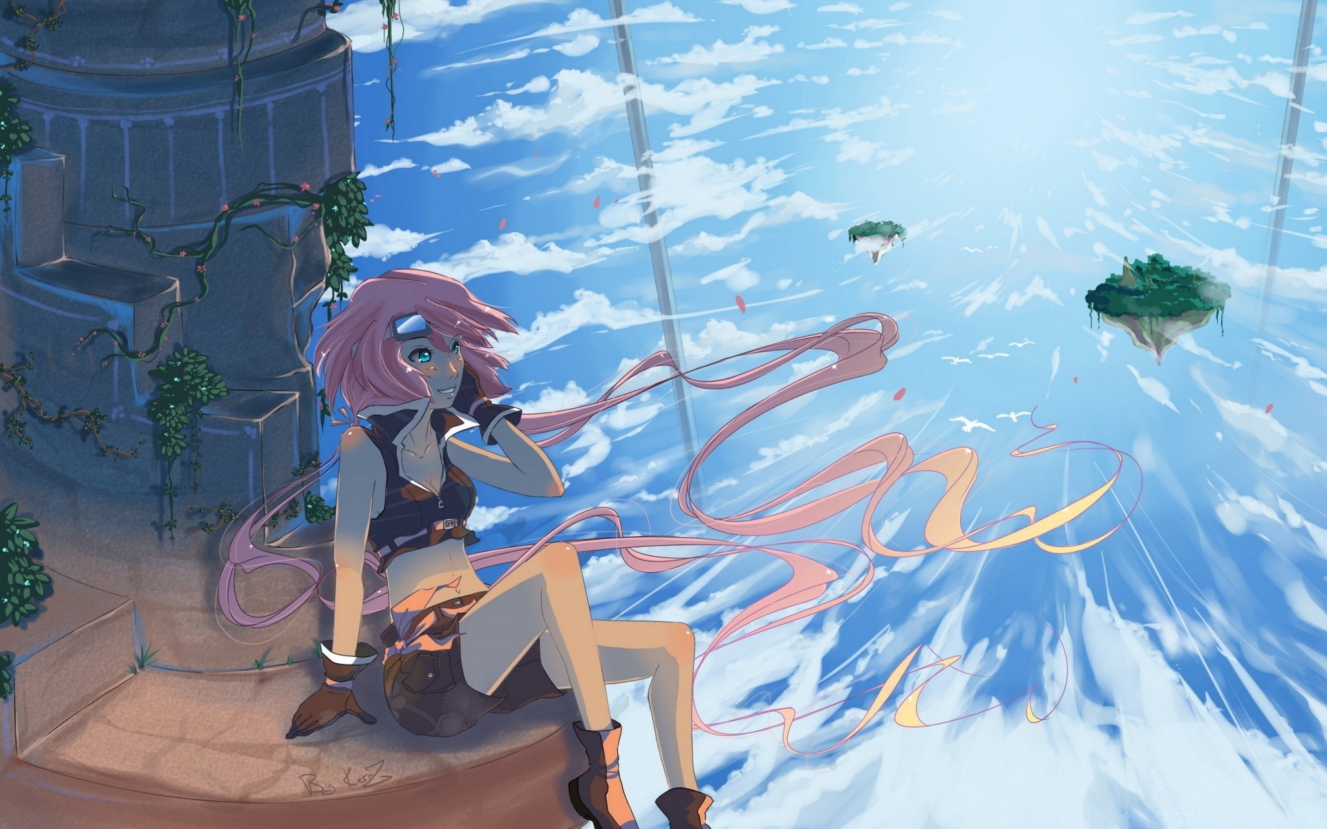 Ein Mädchen sitzt auf einer Struktur, die den Himmel beobachtet