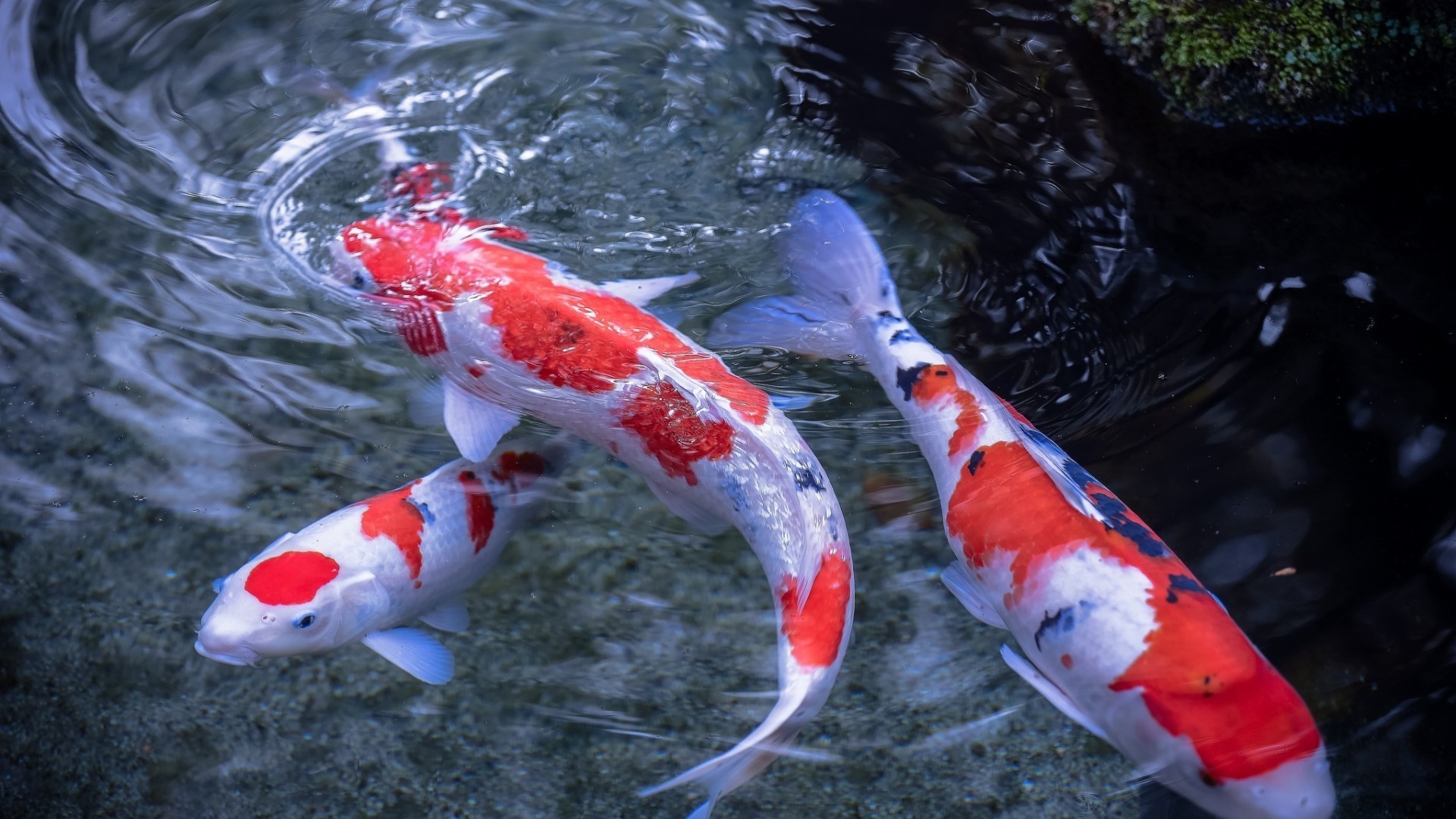Es gibt viele Blätter von Seerosen auf dem Wasser und Fische schwimmen in der Nähe