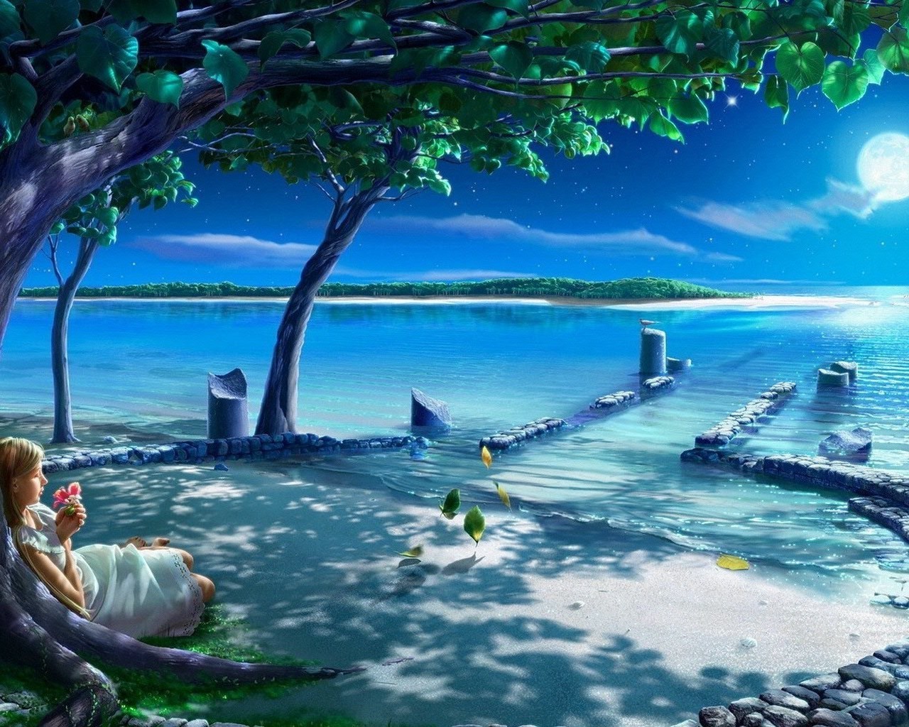 Das mädchen im weißen hemd liegt auf der seite im wasser. landschaft in blauen farbenDas Mädchen im weißen Hemd liegt auf der Seite im Wasser. Landschaft in blauen Farben