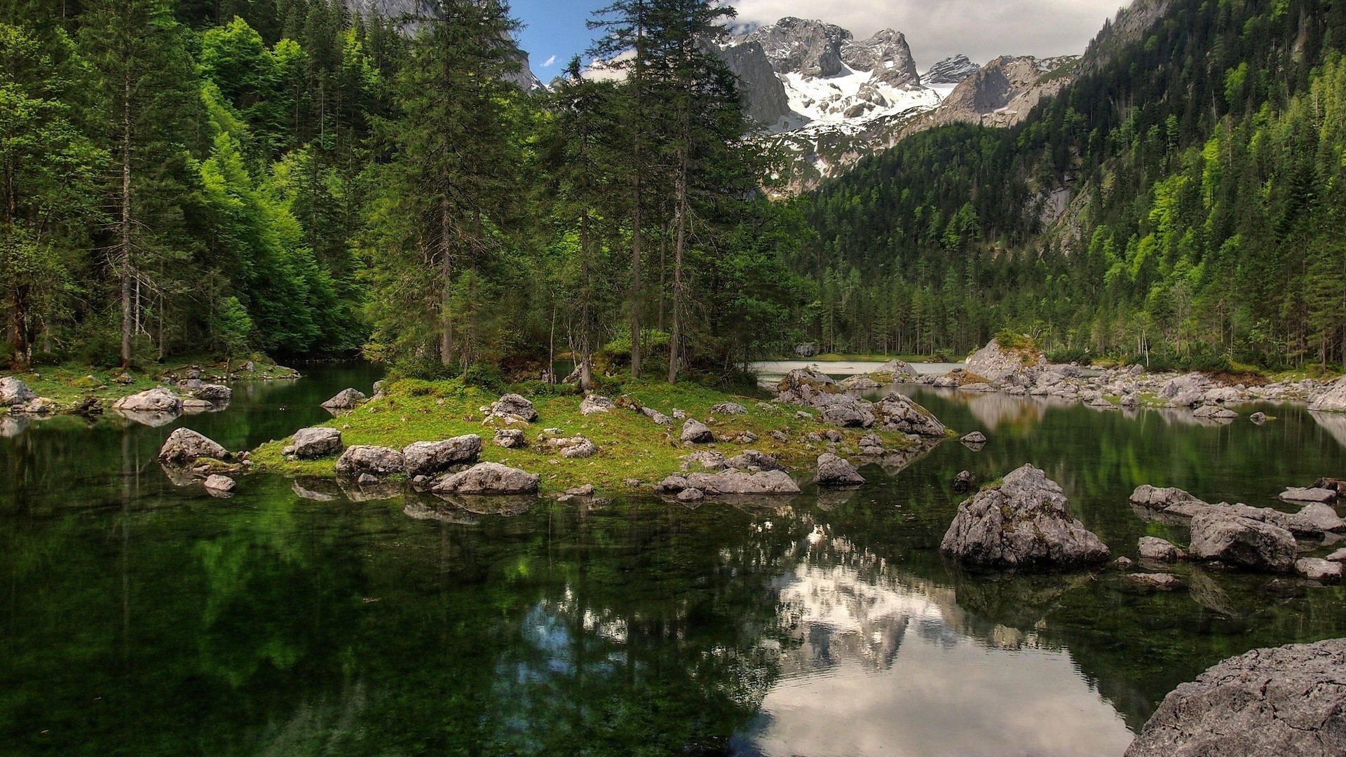 Der See, die Reflexion der Bäume darin, die Dämmerung