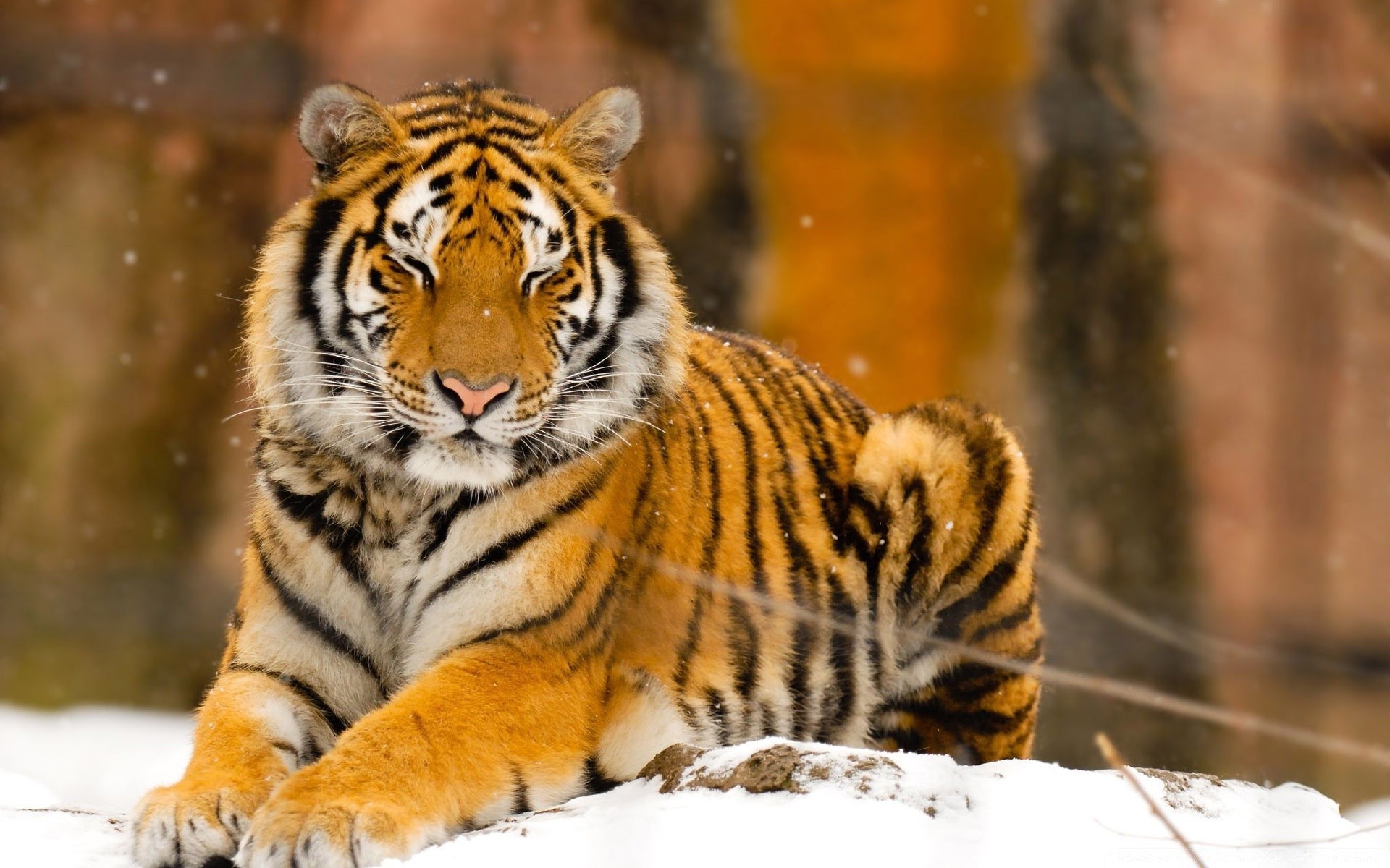 Der Schnee fällt auf den Tiger, der liegt