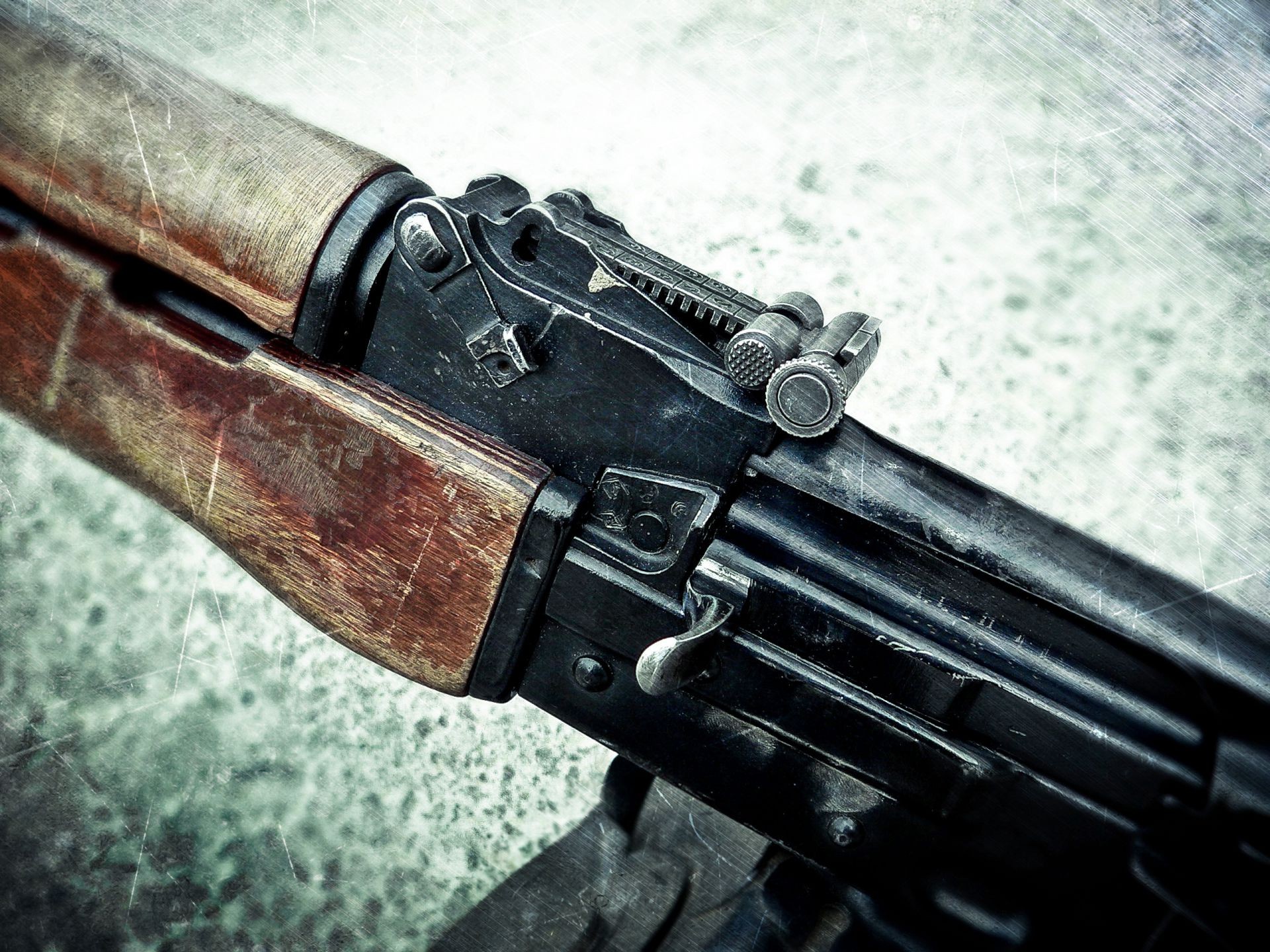 Waffe mit Zielfernrohr auf braunem Hintergrund